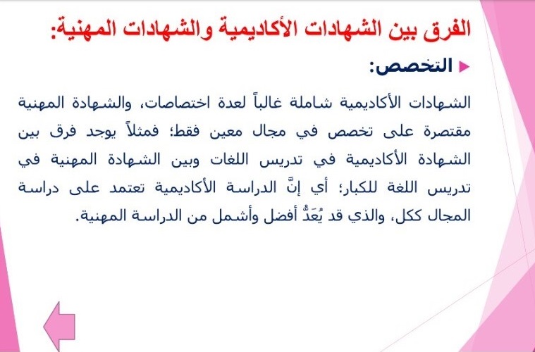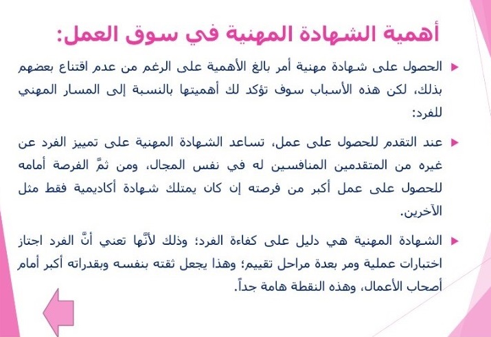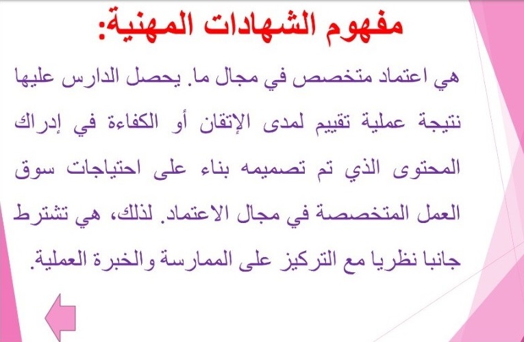 هدفت الدورة التدريبية التي قدمها عضو هيئة التدريس بقسم المحاسبة الدكتور ابوبكر احمد الهادي عبد الرحيم إلى تعرف المتدربين بمفاهيم الشهادات المهنية، الشهادات الاكاديمية، الفرق بين الشهادات المهنية والاكاديمية، أهمية الشهادات المهنية في سوق العمل، بالإضافة إلى تعرف المتدربين على عدد مقدر من الجهات المانحة للشهادات المهنية في تخصصات مختلفة.