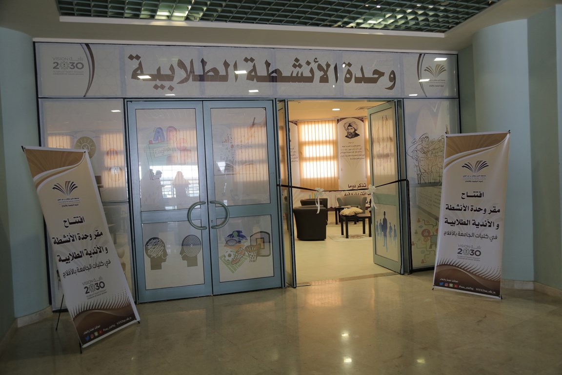 افتتح صباح اليوم المشرف على كليات جامعة الأمير سطام في الأفلاج الدكتور مسفر بن محماس الكبيري وحدة الأنشطة والأندية الطلابية بكليات الجامعة وذلك بحضور وكيل كلية المجتمع للشؤون التعليمية والأكاديمية الدكتور لفاي السلمي.