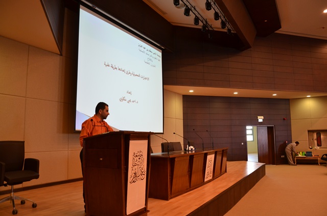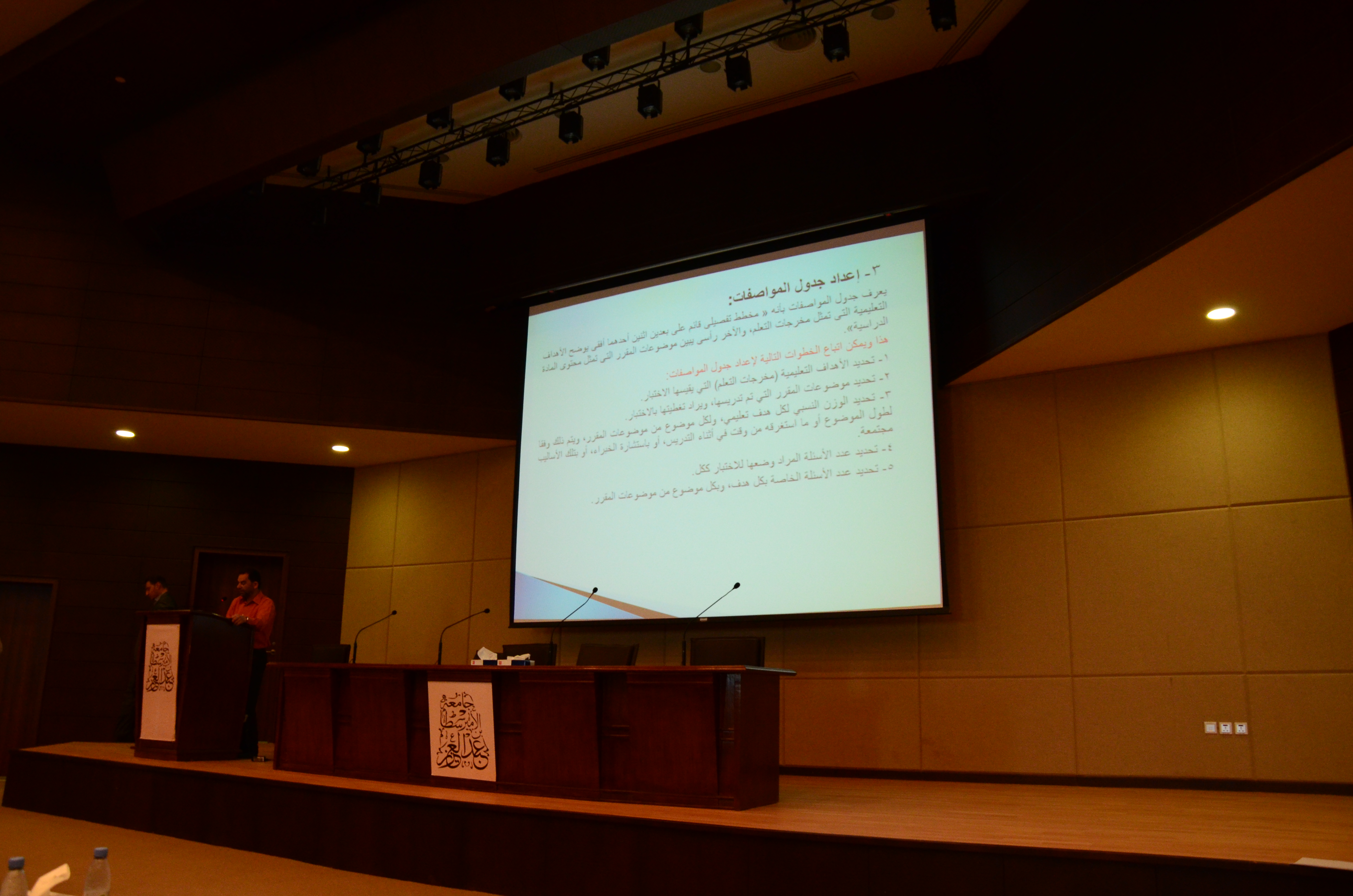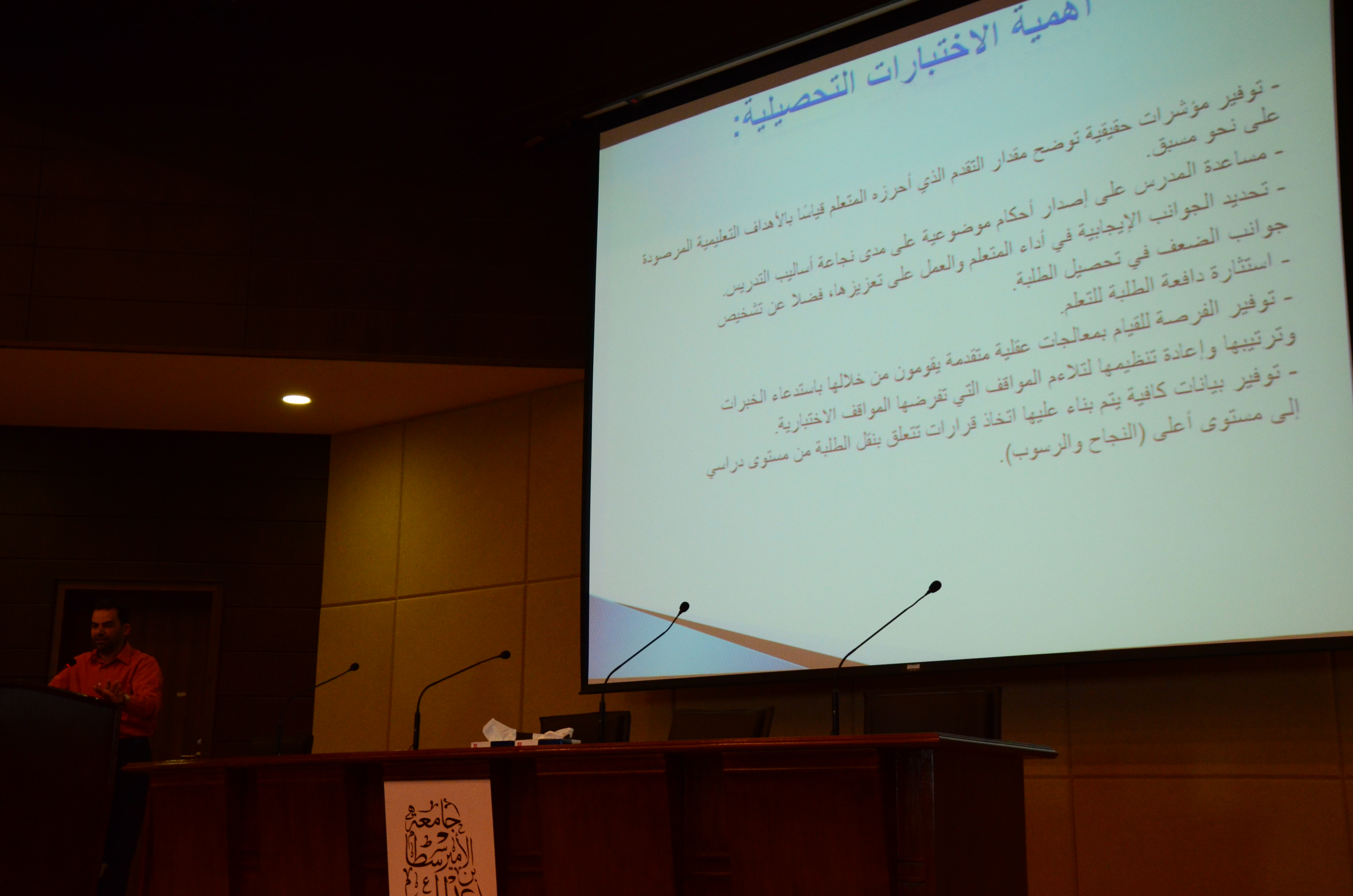 برعاية سعادة المشرف على كليات الجامعة في الأفلاج الدكتور راشد بن محسن ال لحيان أقيمت يوم الأحد الساعة العاشرة صباحاً بتاريخ 2/3/1437هـ في مسرح كليات الجامعة بالأفلاج؛ ورشة عمل لأعضاء هيئة التدريس بعنوان ( الاختبارات التحصيلية وطرق إعدادها بطريقة علمية ) قدم الورشة الدكتور أحمد يحيى ملكاوي المتخصص في طرق التدريس ومناهجها؛ حيث عرض مفاهيم القياس والتقويم والاختبار، والعلاقة بينها, وأهمية الاختبارات التحصيلية, وخطوات إعداد الاختبار ومواصفاته وأنواعه. وقد جرت النقاشات حول موضوع الورشة من السادة الزملاء الحضور من أعضاء هيئة التدريس بالكلية، والتي كان لها عظيم الأثر في الوصول إلى مخرجات عملية، يتم تطبيقها في واقع الامتحانات، وطرق طرح الأسئلة على الطلاب.