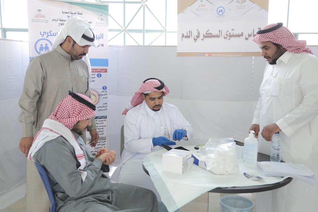 نظمت الأنشطة الطلابية بكليات جامعة الأمير سطام بن عبدالعزيز بالأفلاج بالتعاون مع مستشفى الأفلاج العام اليوم "فعاليات اليوم العالمي للسكري .احتوى الفعاليات على معرضاً به عدة أركان، منها ركن التسجيل يتم فيه تسجيل بيانات للفحص، وركن للكشف الطبي ثم ركن قياس مستوى السكر في الدم و ركن تطعيم الانفلونزا.يذكر أن هذه الفعالية التي نظمها النادي التطوعي بكليات الأفلاج تأتي تزاماً مع اليوم العالمي للسكري .