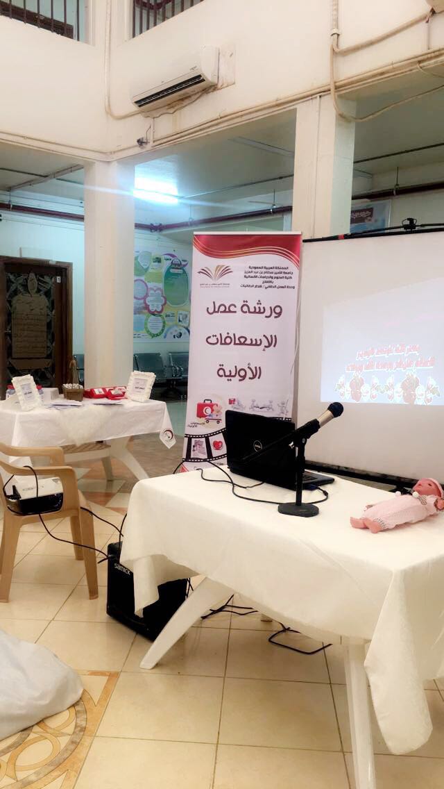 وقد تضمنت الورشة أهمية الإسعافات الأولية، وكيفية القيام بكل من إسعاف فاقد الوعي، والجروح والحروق، والكسور، وحالات الاختناق.
