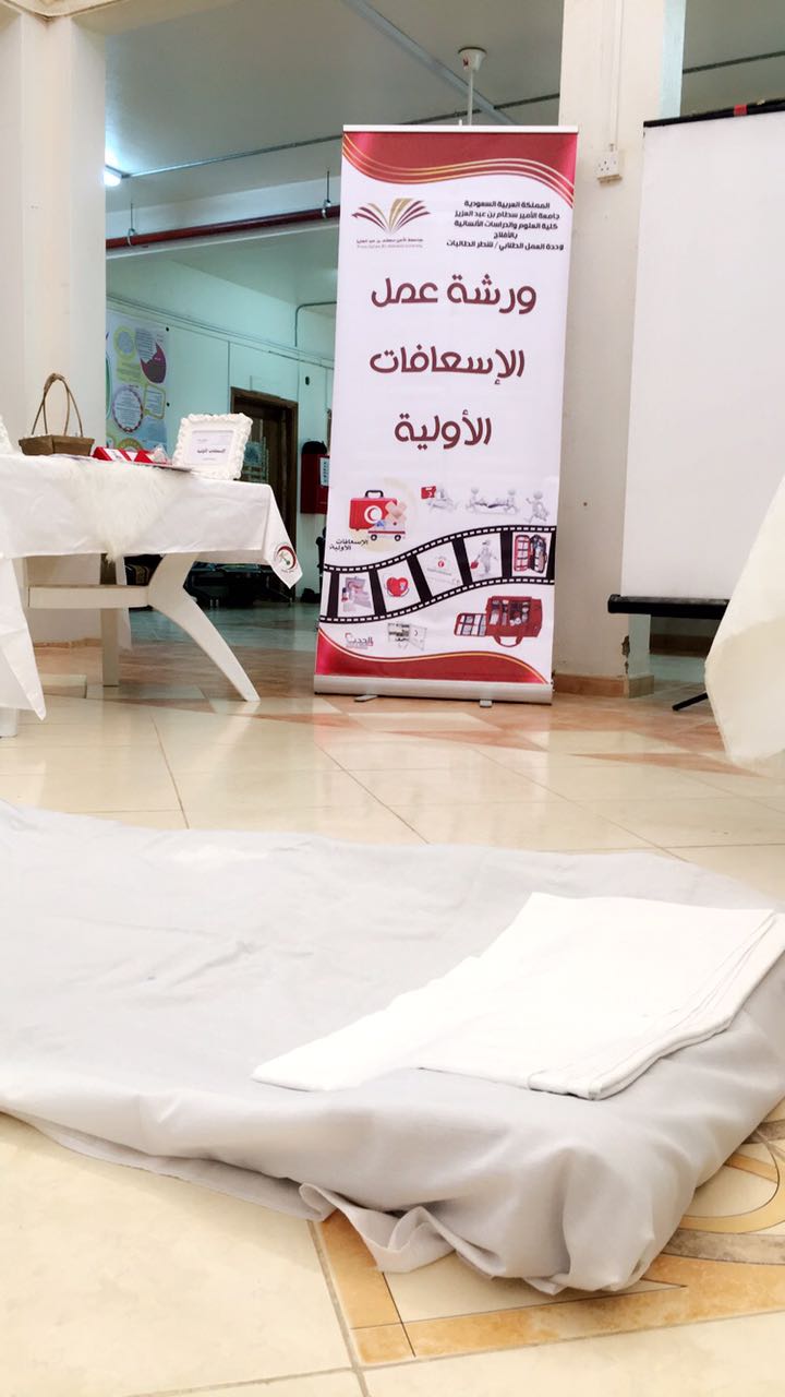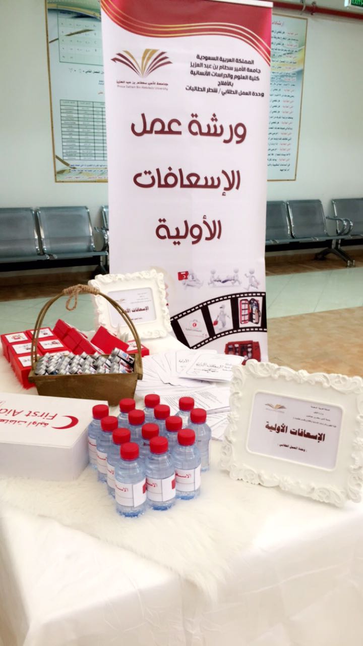 منيره الرشود: نظمت وحدة العمل الطلابي بكلية العلوم والدراسات الإنسانية بالأفلاج ورشة عمل عن الإسعافات الأولية قدمتها طبيبة الكلية د .مناهل صديق يوم الأربعاء 7/29 / 1438هـ في تمام الساعة التاسعة في بهو المبنى الرئيسي