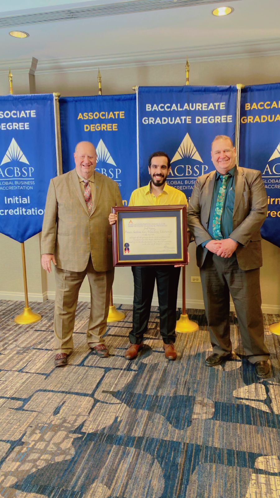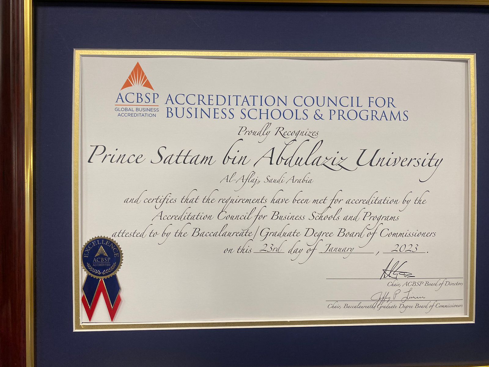 تسلَّم سعادة عميد كلية العلوم والدراسات الإنسانية بالأفلاج الدكتور محمد هذال الدوسري وسعادة رئيس قسم إدارة الأعمال الدكتور بدر بن ناصر الغياثات، شهادة الاعتماد البرامجي لبرنامج الإدارة المالية من قِبل منظمة ( ACBSP ) Accreditation Council for Business Schools and Programs وذلك في المؤتمر السنوي الذي أُقيم بين 29/06/2023 و 2023/7/1 م بمدينة شيكاغو بالولايات المتحدة الأمريكية.