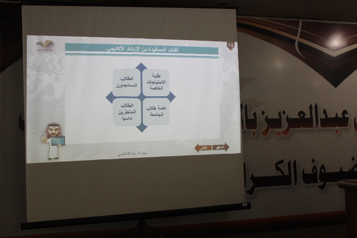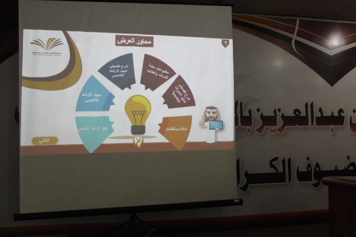 قامت وحدة الإرشاد الأكاديمي بكليات الأفلاج (قسم الطالبات) يوم الأثنين الموافق 1441/6/16هـ الساعة العاشرة والنصف صباحاً في المسرح بتنظيم (البرنامج التثقيفي لمحاور الإرشاد الأكاديمي) من تقديم أ.هدى راشد الجليفي رئيسة وحدة الإرشاد الأكاديمي بوكالة الطالبات بعمادة شؤون الطلاب، يهدف البرنامج إلى التعريف بمهام الإرشاد الأكاديمي و أركانه، تحدثت فيه بشكل تفصيلي عن مهام الإرشاد الأكاديمي ودليل الإجراءات الأكاديمية، ودور العمادة في عملية الإرشاد الأكاديمي، كما وضحت الفئات المستفيدة من الإرشاد الأكاديمي وهم الطالبات المستجدات، والطالبات المتعثرات دراسيا، و ذوات الاحتياجات الخاصة، وعامة طالبات الجامعة. ثم تناولت المطبوعات الهامة للمرشدة الأكاديمية والطالبة، واختتمت البرنامج بالإجابة عن استفسارات الحضور.
