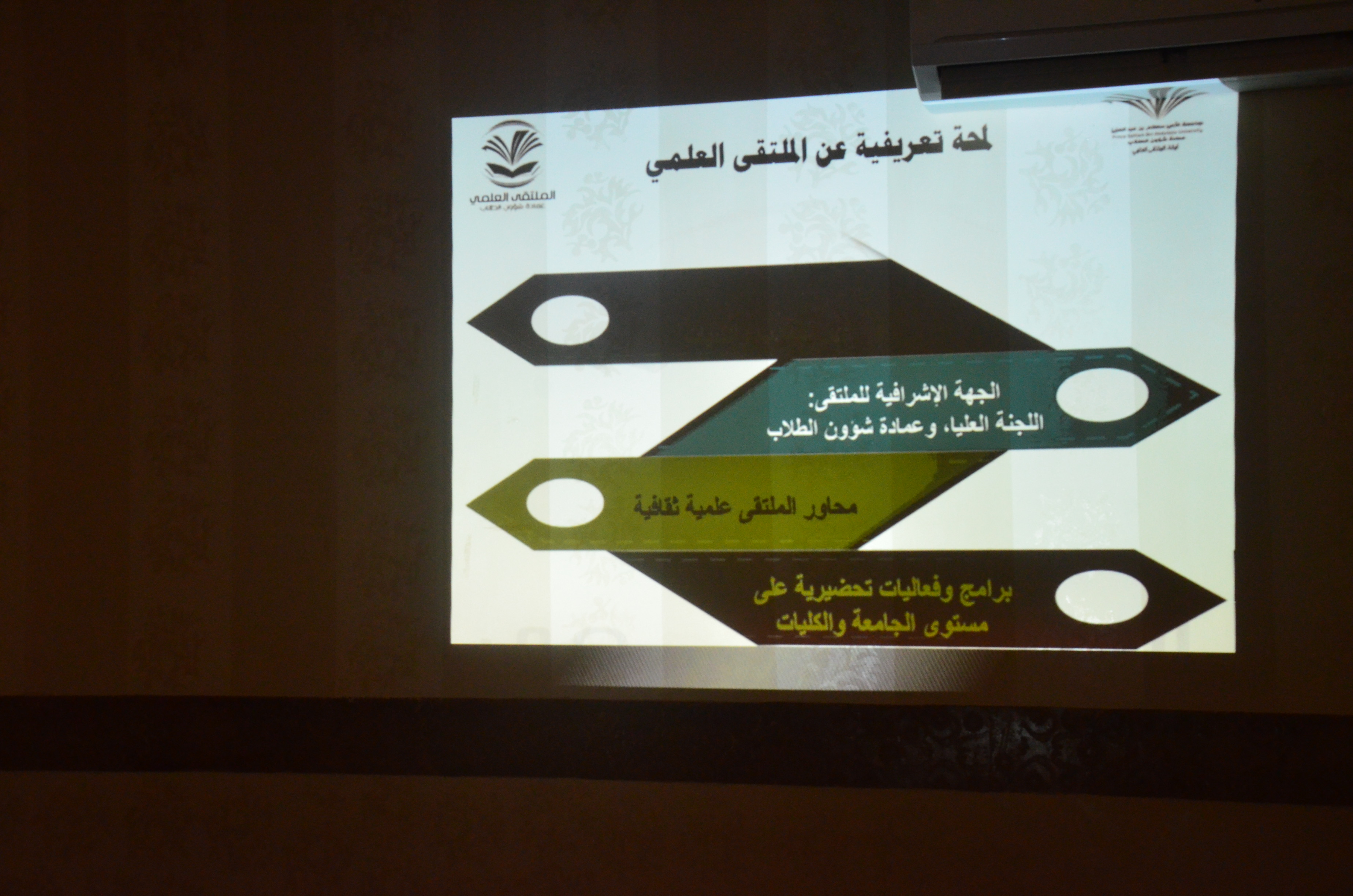 نظمت وحدة العمل الطلابي بمشاركة طالبات المجلس الاستشاري لقاء تعريفي بالملتقى العلمي (الثاني) شطر الطالبات (العلمي ــ الادبي) يوم الأثنين 1439/2/24هـ واستمر ليومين وذلك في مسرح الكلية بعدها ألقت منسقة الملتقى الأستاذة روان الكبيري كلمتها التي تخللت عدة محاور وتم عرضها عرضاً مرئياً أهمها: