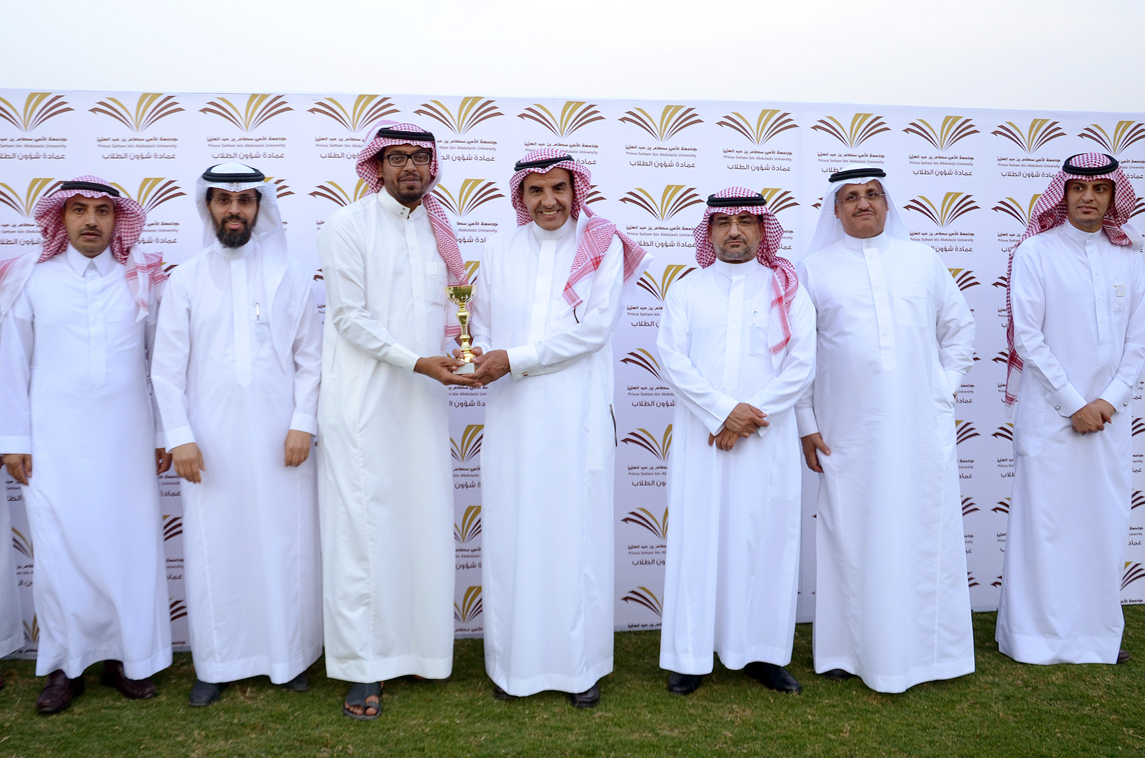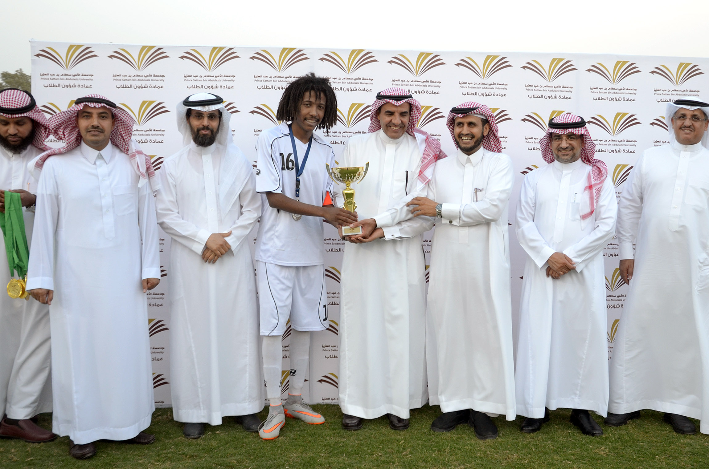 العلاقات العامة والإعلام : برعاية معالي مدير جامعة الأمير سطام بن عبدالعزيز الدكتور عبدالرحمن بن محمد العاصمي وبحضور سعادة المشرف العام على كليات جامعة الأمير سطام بن عبدالعزيز بالأفلاج الدكتور مسفر بن محماس الكبيري وعدد من العمداء ووكلاء. أقامت عمادة شؤون الطلاب المباراة النهائية لبطولة كأس معالي مدير الجامعة في نسختها السابعة لكرة القدم والتي جمعت فريق كلية العلوم والدراسات الإنسانية بالخرج وفريق كلية العلوم والدراسات الإنسانية بالأفلاج عصر يوم الاثنين الموافق ١٤٣٨/٢/٧هـ على أرض ملعب نادي الشعلة بالخرج.   بدء الشوط الإول بمستوى متقارب بين الفريقين، حيث تمكن فريق كلية العلوم والدراسات الإنسانية بالخرج من تسجيل هدفه الأول سجله اللاعب فهد الفهادي، تبعها إنطلاقة حماسية واضحة من كلا الفريقين تمكن من خلالها تسجيل الهدف الثاني عن طريق اللاعب سعد السويلم، وبعدها تمكن فريق كلية العلوم والدراسات الإنسانية بالأفلاج من تسجيل الهدف الأول سجله اللاعب محمد الهليل لتنتهي المباراة بفوز كلية العلوم والدراسات الإنسانية بالخرج بهدفين لهدف.   بعد انتهاء المباراة تقدم معالي مدير الجامعة للتكريم، حيث حصلة كليات الجامعة بالأفلاج على جائزة أفضل منسق والتي حققها الأستاذ إبراهيم بن زيد البحري.   بعدها سلم معالية الميداليات الفضية لصاحب المركز الثاني في البطولة فريق كلية العلوم والدراسات الإنسانية بالأفلاج،  ومن ثم تقدم صاحب المركز الأول في البطولة فريق كلية العلوم والدراسات الإنسانية بالخرج لاستلام الميداليات الذهبية وكأس البطولة.