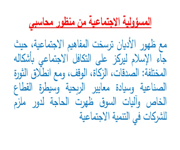 تناولت الدورة المسؤولية الاجتماعية بمفهومها الواسع، من خلال مراحل تطورها واهميتها بالنسبة للدول ومؤسسات الاعمال والمجتمع بصورة عامة، بالإضافة الى ذلك هدفت الدورة الى تعريف المتدربين بأبعاد وعناصر المسؤولية الاجتماعية الاقتصادية والقانونية والاجتماعية، كما هدفت الدورة التدريبة الى مناقشة القياس والافصاح المحاسبي للتكلفة والعائد الاجتماعي.