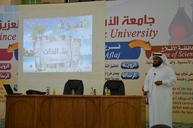 نظمت كليات الجامعة بالأفلاج اليوم دورة تدريبية عن (بناء الذات) للمدرب سعد خميس الشراري، برعاية المشرف على كليات الأفلاج الدكتور راشد بن محسن آل لحيان؛ حيث استهدفت أعضاء هيئة التدريس والكادر الإداري بكليات الفرع، وقد تناولت الدورة شرحًا لتطوير تنمية الذات والقدرات الكامنة داخل الأشخاص وسبل تطويعها, فيما شملت الدورة أهم موارد الإنسان الشخصية وجوانب بناء الذات وتطويرها وتحفيزها لذلك.