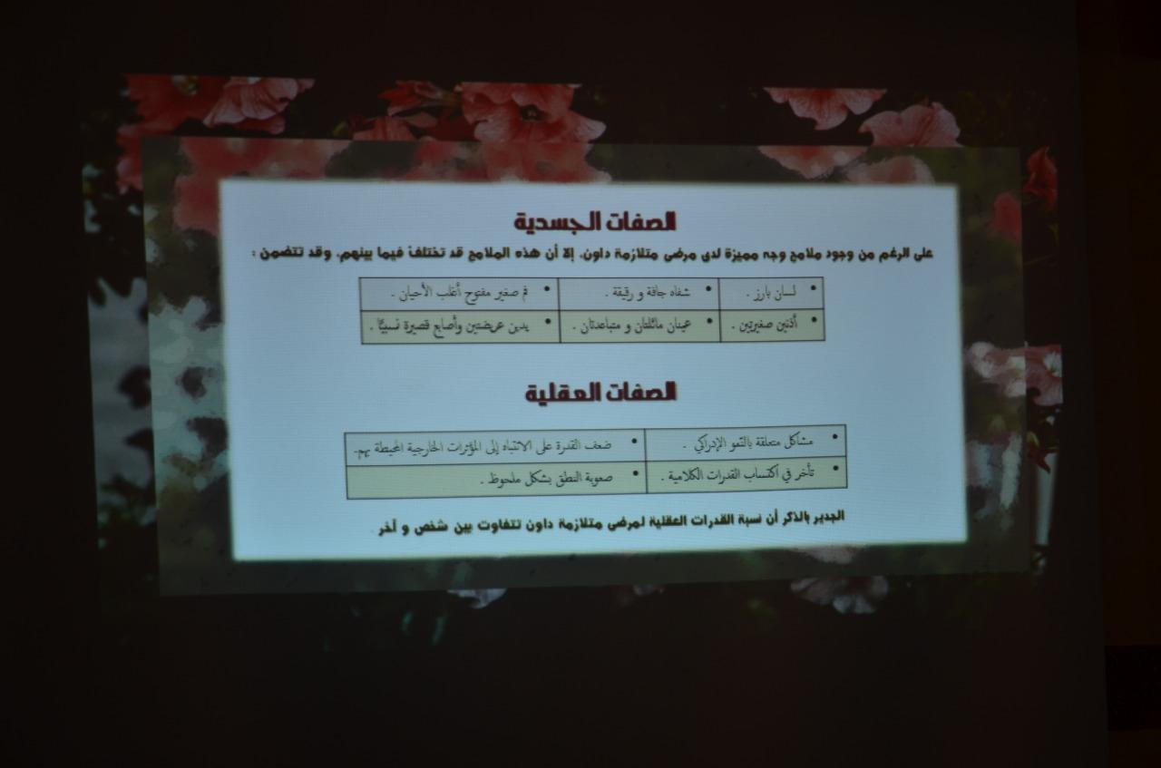 قامت وحدة العمل الطلابي ممثلة في البرامج الثقافية والاجتماعية بالتعاون مع قسم الرياضيات بكليات الأفلاج (قسم الطالبات) يوم الثلاثاء 1441/3/22هـ الساعة 12 مساءً بتنظيم برنامج بعنوان "تأخرت قدراتهم وتسابقت خطواتهم"، ويهدف البرنامج إلى تعريف الطالبات بمتلازمة داون وأنواعها وأبرز صفات حامليها، وتعزيز صلة المجتمع بهذه الفئة، وتوضيح بعض الطرق الملائمة لتعليمهم والتعامل معهم، كما تم تصحيح بعض الاعتقادات والأفكار الواهمة والمنتشرة حول فئة متلازمة الداون، واختتم البرنامج بالتأكيد على ضرورة الاهتمام بهم وبقدراتهم ودمجهم مع أفراد المجتمع، وتم خلال البرنامج توزيع منشورات توعوية عن متلازمة داون.