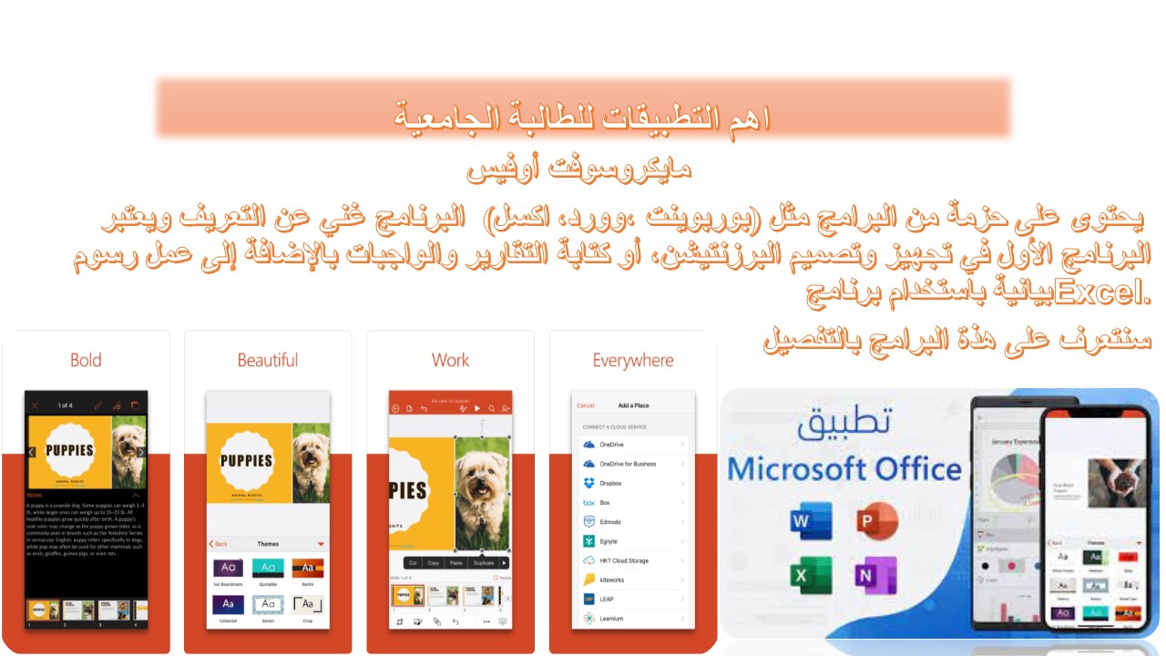 احتوى البرنامج على مقدمة عن أهمية تطبيقات الجوال للطالبة الجامعية ، وكذلك التعرف على بعض التطبيقات لإنشاء التقارير وحل الواجبات وعمل الرسوم البيانية والعروض ، كما تم التعريف بعض التطبيقات التعاونية التي تُمكن الطالبة من المناقشة ومشاركة الملفات ، وأيضا التعرف على تطبيقات تحسن مستوى اللغة الإنجليزية بالإضافة للترجمة ، وبعضها يقوم بتقديم كورسات في جميع التخصصات .