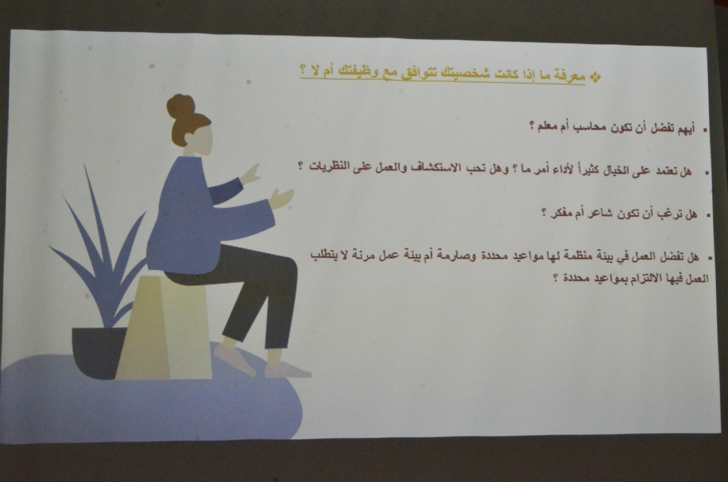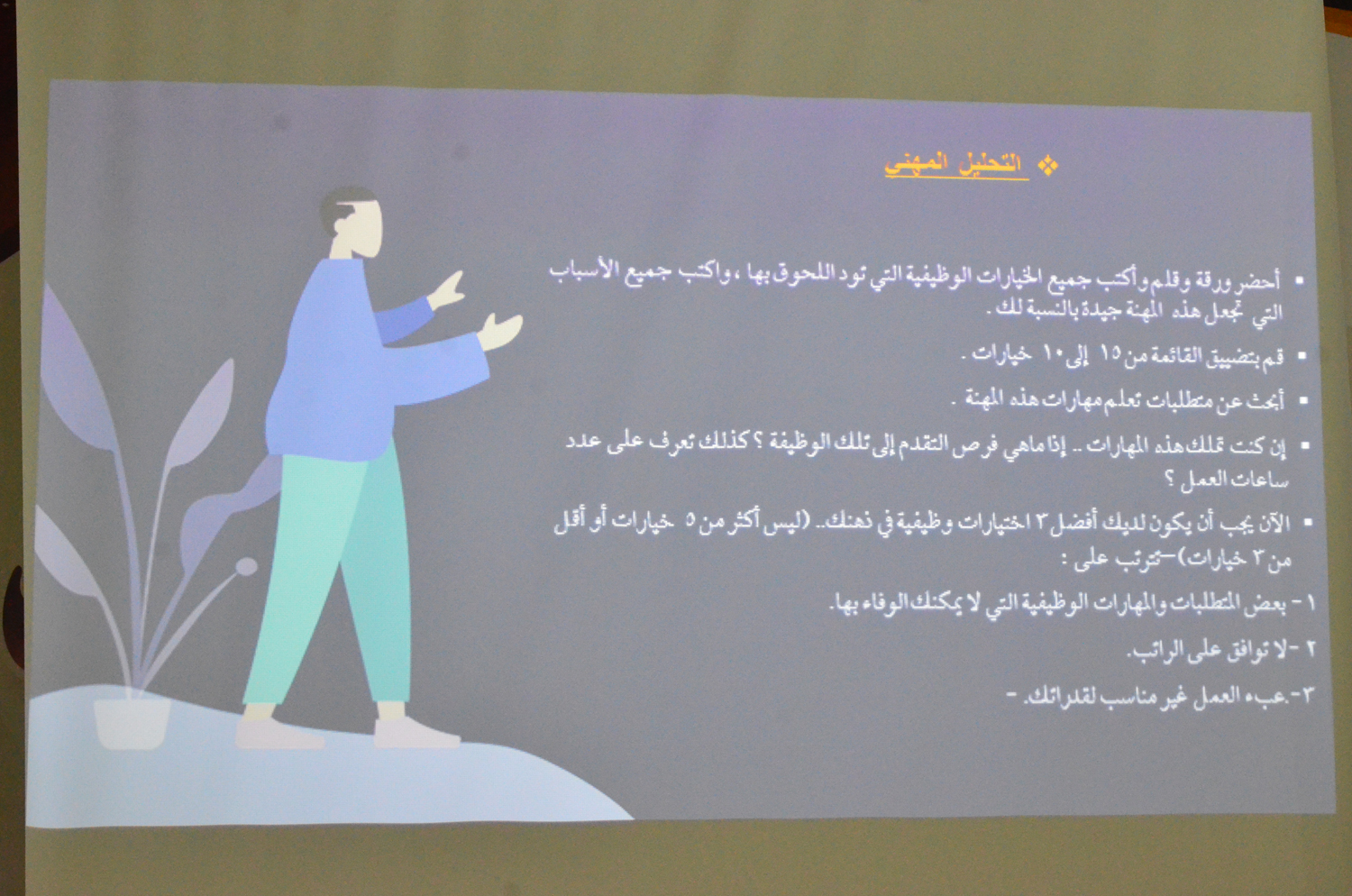 أقامت وحدة الخريجات بكليات الأفلاج ( شطر الطالبات ) يوم الخميس 1441/1/27هـ الساعة العاشرة صباحاً في المسرح دورة بعنوان "كيف تبحثين عن الوظيفة المناسبة" قدمتها أ. منيرة آل قرون , تحدثت فيها عن كيفية تحليل الذات وتقييم أسلوب العمل والمواهب و طرق اختيار المهنة التي تساعد في استغلال الموهبة و لقاء الخبراء في نفس المجال الوظيفي الذي تهتم به كما ذكرت خطوات التحليل المهني لاختيار الوظيفة المناسبة و ما هي الأهداف التي تتمنى أن تتحقق في هذه المهنة .