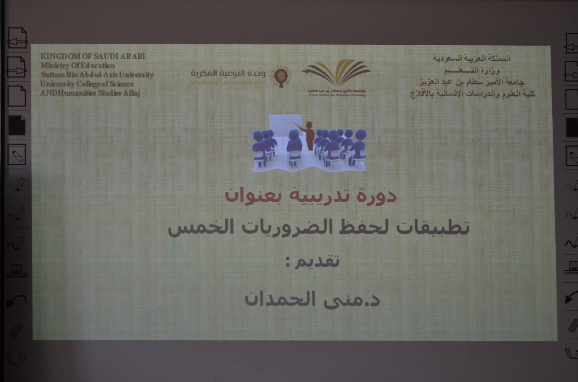 نظمت وحدة التوعية الفكرية بكلية العلوم والدراسات الإنسانية بالأفلاج يوم الثلاثاء الموافق1440/2/22 هـ عند الساعة العاشرة صباحاً في قاعة التدريب دورة تدريبية بعنوان (تطبيقات لحفظ الضروريات الخمس) ضمن مشروع نحو جامعة واعية ٣. نفذت الدورة د. منى الحمدان. كما صاحب الدورة معرض تعريفي لوحدة التوعية الفكرية زود بمنشورات عن فكرة المشروع و مكوناته ومحاوره والخطوط الاساسية للوحدة.وتناولت محاور الدورة مقاصد الشريعة الثلاث: (الضروريات والتحسينات والحاجيات). وتم ربط كل ذلك بالواقع المعاصر, والحث على الوقوف بحزم ضد كل ما يؤدي إلى الإخلال بهذه الضروريات من حيث نبذ كل فكر دخيل أو معتقد فاسد, والتعاون ضد كل من يحاول العبث بأمن الوطن, أو التفريق بين أبنائه. واختٌتِمت الدورة بالتأكيد على ضرورة الحفاظ على الضروريات الخمس؛ لنتمكن من الانطلاق نحو مستقبل واعي. وفِي نهاية الدورة كرمت وكيلة الكلية الدكتورة فريدة محمد عقيلي الدكتورة منى الحمدان وشكرتها على مابذلته من جهد في هذه الدورة.