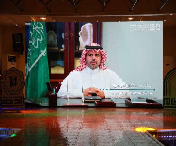 اُفتتِح الحفل بالسلام الملكي ثم مسيرة الطالبات الخريجات، ثم تُليت آيات من القرآن الكريم تلتها الطالبة سارة آل دحيم، وبعدها ألقت سعادة الدكتورة/ بشرى الحماد وكيلة الجامعة لشؤون الطالبات، نيابةً عن سعادة الدكتور عبدالرحمن الطلحي رئيس الجامعة كلمةً يفخر فيها بخريجات الجامعة في جميع المجالات، وتقدم فيها بالشكر الجزيل لمن لهم الفضل بعد الله في هذا الإنجاز من كادر أكاديمي، وجهودٍ للدولة في دعم التعليم في وطننا الغالي ، تلتها كلمة سعادة الدكتور/ محمد هذال الدوسري عميد الكلية، حيث رحب فيها بالحضور وبارك للخريجات تخرجهن والوصول إلى هذه اللحظة، ثم عبّر فيها عن فخره واعتزازه بمشاركتهن حفل تخرجهن، ثم اختتم كلمته بهمسة أبوية لبناته الخريجات ذكر فيها ضرورة امتداد العلم وعدم انقطاعه مادام الإنسان على قيد الحياة؛ فحثهن على مواصلة طلب العلم، وتطوير ذاتهن، والنهل من شتى المعارف والعلوم، وأخيرًا قدم لهن التوفيق والسداد. جاء بعد ذلك كلمة سعادة الدكتورة / مها العنزي وكيلة الكلية، والتي افتخرت فيها بالإنجاز الذي بلغنه طالباتها، كما وجهت الشكر لأمهات الطالبات على مابذلنه من جهد لتصل بناتهن إلى هذا المستوى من التعليم، وكذلك وجهت رسالة إلى الطالبات الخريجات تحثهن فيها على العمل على خدمة الوطن والمساهمة في تقدمه ورفعته ردًا لجميله.