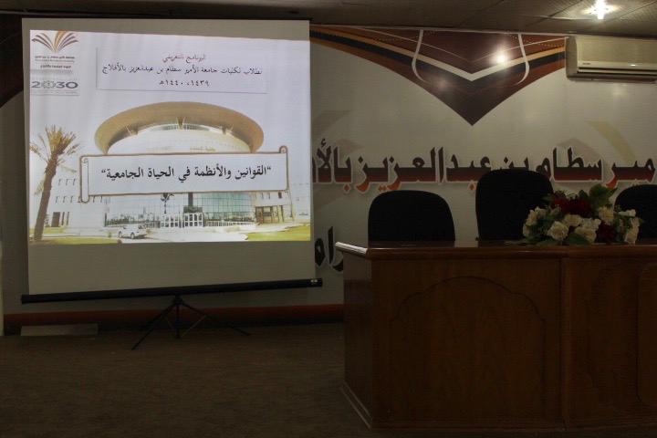 نظمت كليات الأفلاج (قسم الطالبات) يوم الثلاثاء 1441/6/3هـ لقائها التعريفي للطالبات المستجدات بالفصل الدراسي الثاني في مسرح الكلية، بدأ اللقاء بآيات من القرآن الكريم، تلاه العرض الخاص بالبرنامج التعريفي ثم قُدّمت محاضرة القوانين والأنظمة في الحياة الجامعية و المتعلقة بمسيرة الطالبات الأكاديمية، ثم محاضرة تعريفية بلجنة حقوق الطالبات، ثم عرض توضيحي عن وحدة الأنشطة الطلابية و وحدة القبول والتسجيل، بعد ذلك ألقت وكلية الكليات سعادة الدكتورة فريدة عقيلي كلمتها في لقاء ودي يجمعها بمشرفات الأقسام و الطالبات المستجداترحبت فيها بالجميع و قدمت النصائح والتوجيهات اللازمة وتمنت لهن التفوق والتميز في حياتهن الأكاديمية. في ختام البرنامج تم أخذ الطالبات في جولة تعريفية على مرافق الكلية، وتسليم الطالبات المطبوعات التعريفية الخاصة بالأقسام الأكاديمية و تقديم الضيافة لجميع الحضور.