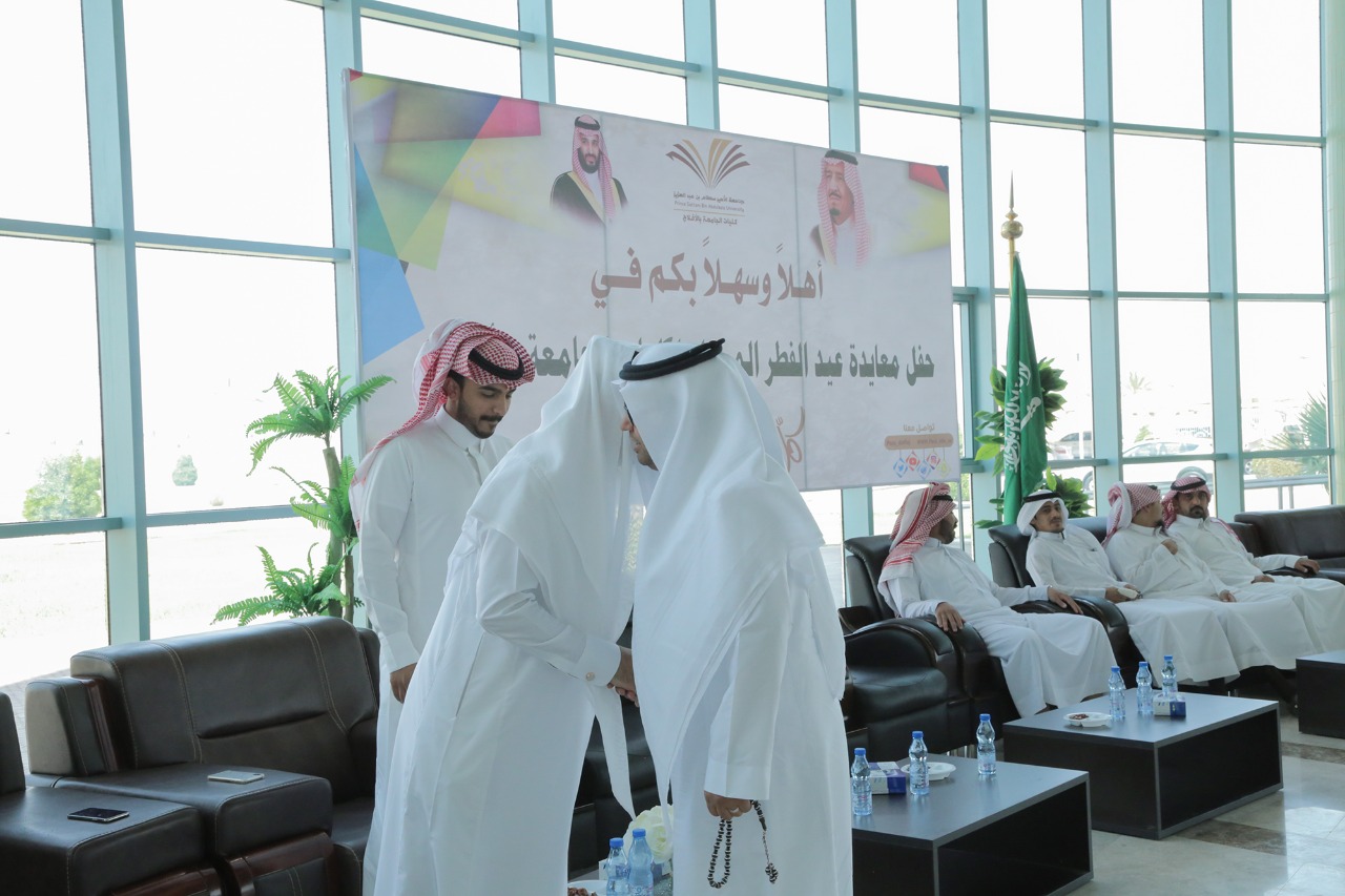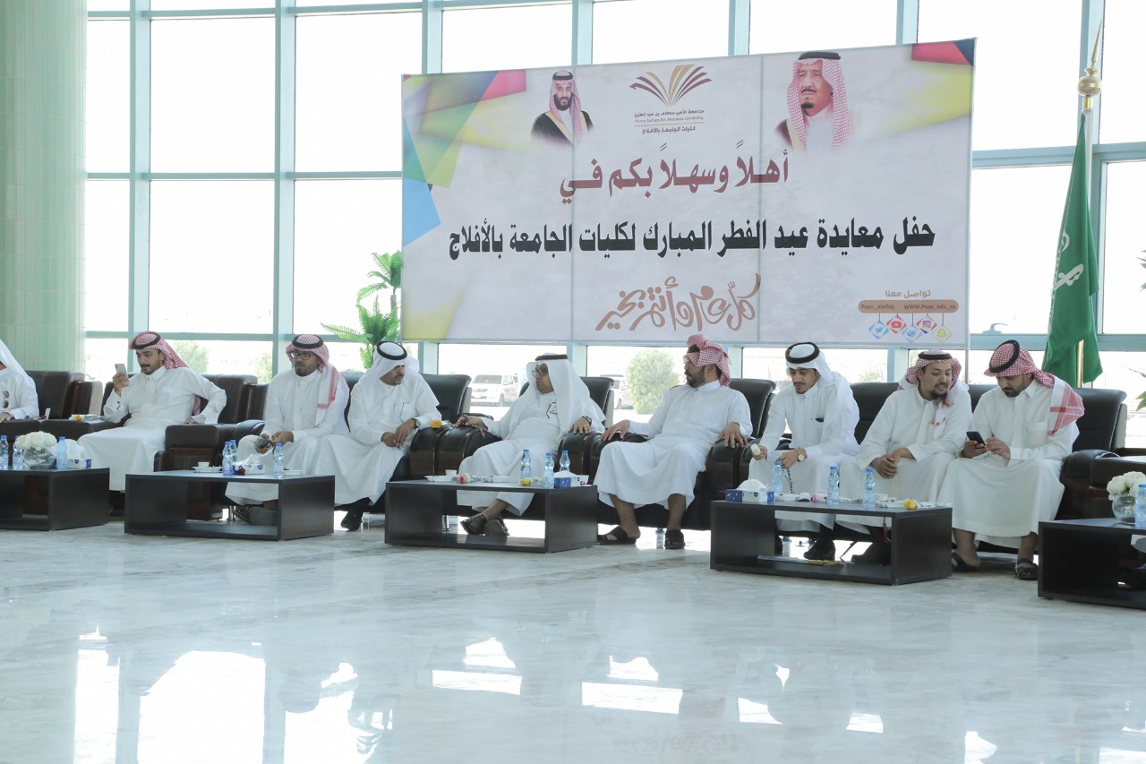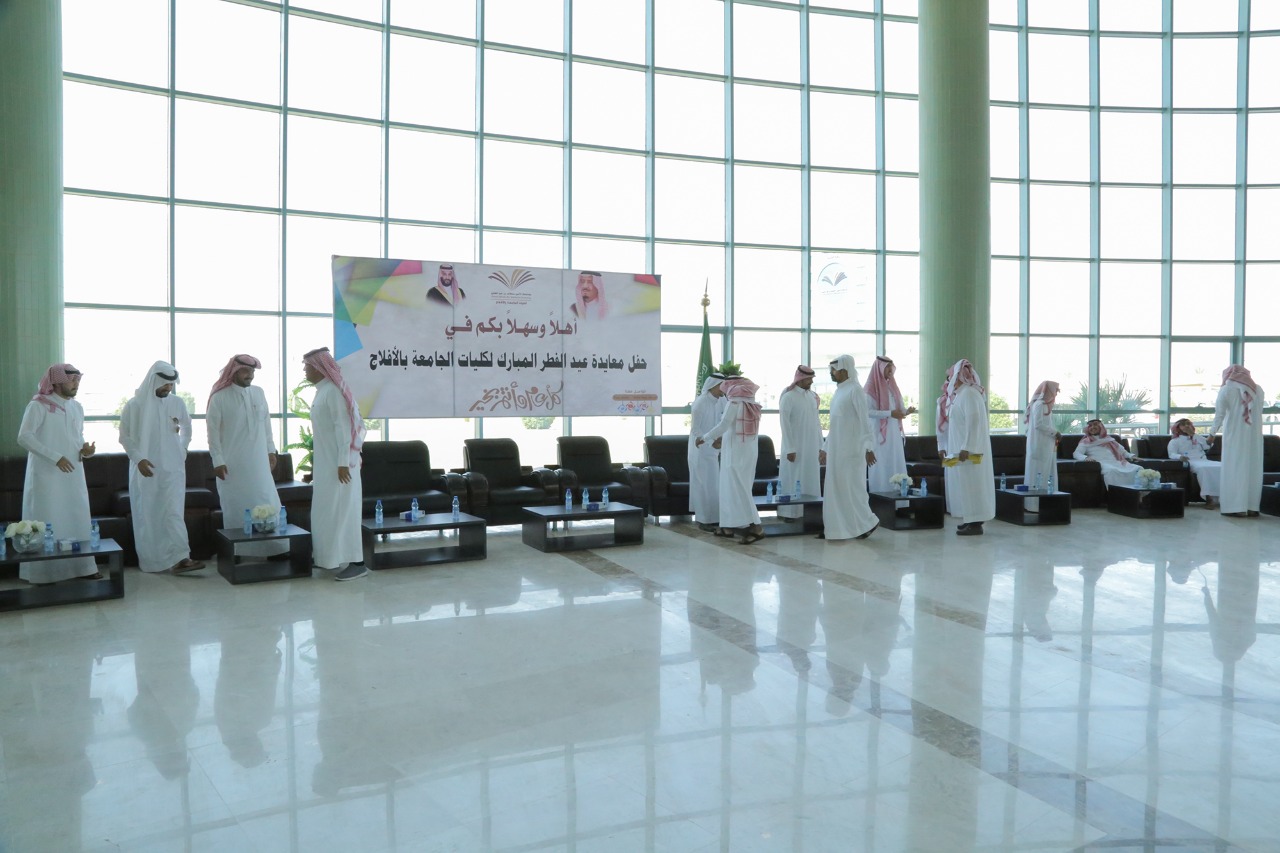 نظمت كليات جامعة الأمير سطام بن عبدالعزيز بالأفلاج يوم الأحد 1440/10/6هـ، حفل معايدة لمنسوبيها بمناسبة عيد الفطر المبارك وذلك بحضور وكيل كلية المجتمع الدكتور لفاي السلمي وعدداً من اعضاء هيئة التدريس والموظفين. تبادل الجميع التهاني والتبريكات بمناسبة عيد الفطر المبارك خلال الحفل الذي اقيم في بهو كليات الجامعة وسط أجواء تسودها المحبة، كما هنأ السلمي الحضور بعيد الفطر السعيد، سائلاً الله للجميع التوفيق والسداد وانطلاقة عمل جاد شعاره التميز والإبداع .