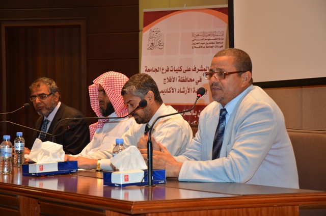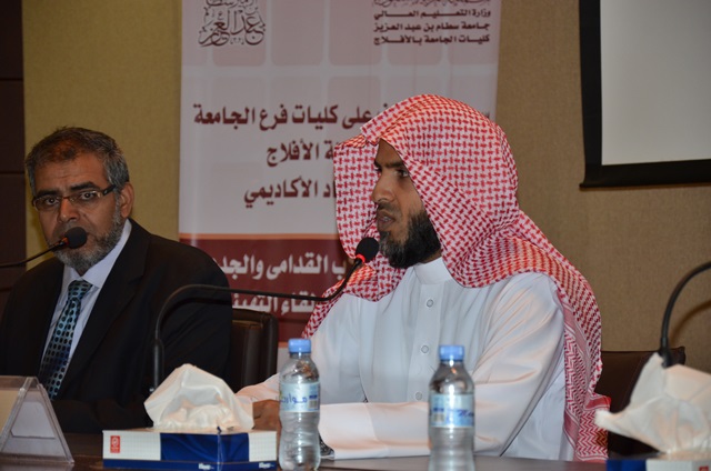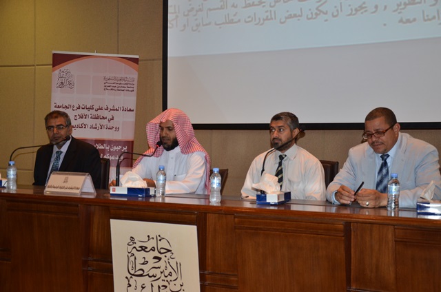 التقى المشرف على كليات الجامعة بالأفلاج الدكتور راشد بن محسن آل لحيان  الطلاب الجدد؛ حيث تناول اللقاء عدة محاور تخص الإرشاد الأكاديمي والعملية التعليمية، فقد بدأ اللقاء بعرض مرئيّ قدمه الدكتور منصور فتحي المشرف على الإرشاد الأكاديمي بالفرع تناول فيه تعريفًا عامًّا عن الجامعة وكليات الفرع وأبرز الوحدات والمرافق التي تخدم الطالب، كما تطرق إلى ضرورة تفعيل كل طالب لموقعة الشخصي والاستفادة من الخدمات الطلابية على موقع الجامعة فمن خلالها يمكن للطالب أن يعرف ما يغني عن كثير من الأسئلة التي تدور في رأسه، ثم تناول قواعد النظام الأكاديمي، وأبرز المصلحات والضوابط في العملية التعليمية. من جانبه رحب المشرف على كليات الجامعة بالأفلاج بالطلاب الجدد وبين لهم أهمية ما هم فيه من طلب للعلم مما يستوجب التحلي بأخلاق طالب العلم وآدابه في ظل مناخ مهيأ وممهد من قبل حكومة خادم الحرمين الشريفين حفظه الله،  كما حث الطلاب على الجد والمثابرة وطلب العلم بنية صادقة وإخلاص حتى يكون نموذجًا نافعاً لدينهم ووطنهم , وشدد على أن كل مرافق الفرع ومنسوبيه في خدمة الطالب . كما تناول الأستاذ الدكتور محمود سليم مساعد العميد للتطوير والجودة بعض القضايا التعليمية والضوابط الأكاديمية التي تخص الطلاب .   كذلك تناول الدكتور عابد الغولي مساعد المشرف للشؤون التعليمية بعض النقاط التي تخص الطالب في توجيهه،  وشرح مرافق المبنى، وقاعاته الدراسيّة.