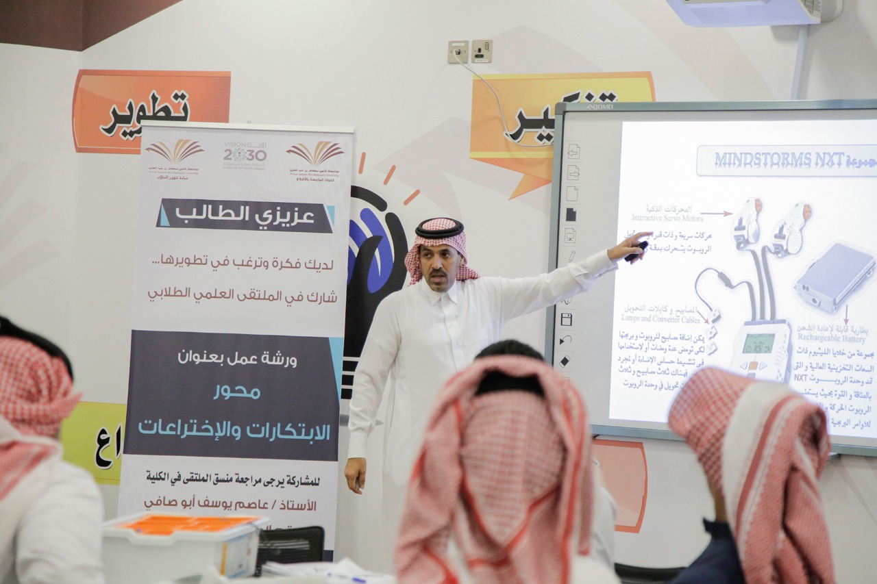 نظمت لجنة الملتقى العلمي بكليات الأفلاج اليوم الأربعاء لأعضاء هيئة التدريس والطلاب ورشة عمل بعنوان (الروبوت NXT)، وذلك استعدادًا للملتقى العلمي الطلابي بجامعة الأمير سطام. وضمنت ورشة العمل التي قدمها الدكتور محمد بن عويس آل كليب عدداً من المحاور؛ منها مقدمة عن الروبوت وبداياته والتطور الحاصل في التقنية ودخول الروبوت في جميع مجالات الحياة، موضحاً أن الروبوت يعتمد في آلية عمله على جزئين رئيسين هما الفيزياء الميكانيكية و البرمجة، وشهدت ورشة العمل عرضا مرئيا لمكونات الروبوت الميكانيكية وأنواع المسابقات في مجال الروبوت ومشاهدة مقاطع فيديو لعدة مسابقات لمصارعة السومو وشد الحبل و تتبع الخط وأهمية الحساسات في هذه المسابقات.وفي نهاية الورشة كان هناك تطبيق عملي لتركيب روبوت من قبل الطلاب لتصميم سيارة متحركة باستخدام جميع أدوات الحقيبة الميكانيكية للروبوت NXT، ثم فتح باب النقاش أمام الحضور للإجابة عن أسئلة واستفسارات المشاركين.