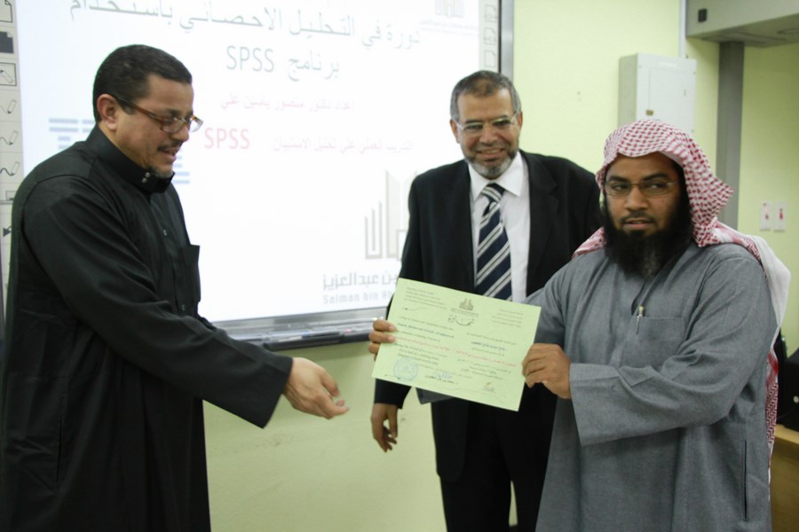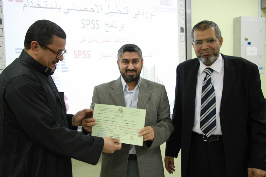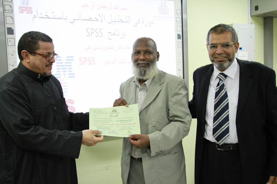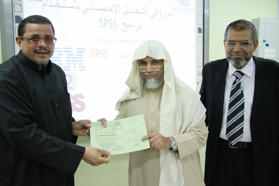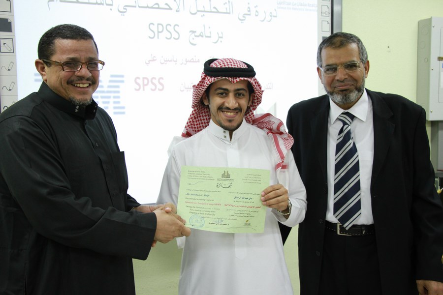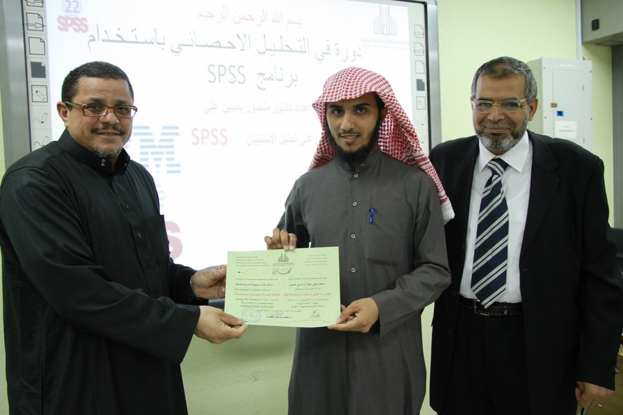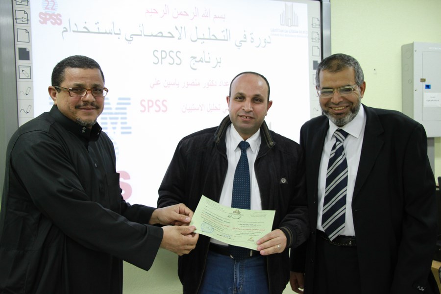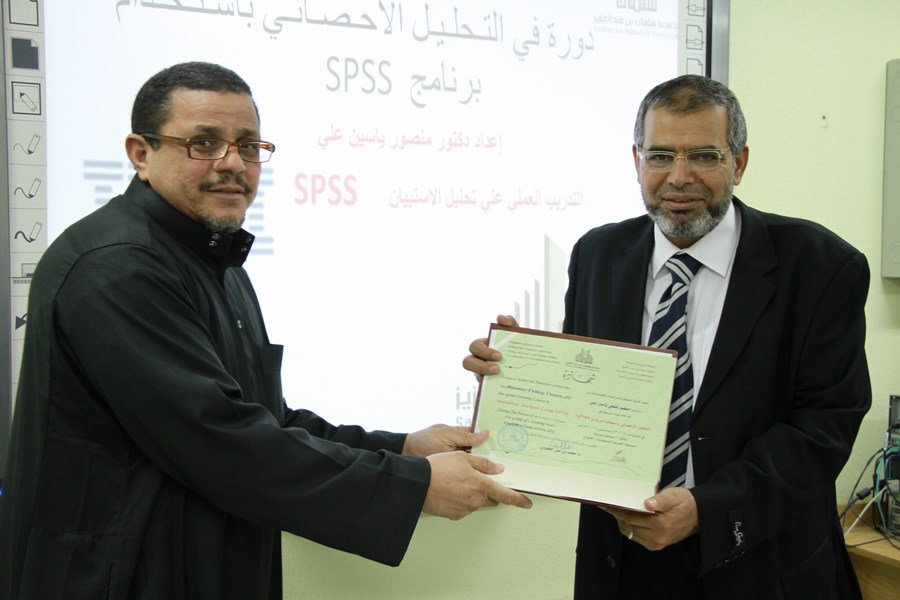 د.أحمد النجمي-العلاقات العامة: عقدت كليات الجامعة بالأفلاج ورشة تدريبية في استخدام برنامج التحليل الإحصائي spss   في إطار توجيهات المشرف على كليات الأفلاج الدكتور محمد بن علي الكبيري . وقد قدم الدورة الدكتور منصور فتحي ياسين عضو هيئة التدريس بقسم الرياضيات والتي استمرت لمدة أربعة أيام حيث بدأت يوم الأحد الموافق 8/2/1436هـ وانتهت الأربعاء 11/2/1436هـ . بواقع 12 ساعة تدريبية. وقد شملت الدورة التعريف ببرنامج spss  وأهميته في التحليل الإحصائي وتحليل الاستبانات والاستفادة منه في الأبحاث العلمية كما شملت التدريب العملي والنماذج التطبيقية على البرنامج.  كما شملت أيضًا بعض موظفي الجهات الحكومية والمؤسسات الأهلية ممن تمّ توقيع اتفاقية شراكة بينهم وبين كليات الجامعة في الأفلاج . وتأتي هذه الدورة في إطار توجه الجامعة إلى تنمية مهارات وقدرات أعضاء هيئة التدريس والموظفين وشرائح المجتمع المختلفة حيث شملت الدورة منسوبي كليات الجامعة من أعضاء هيئة تدريس وموظفين وبالأخص موظفي وكالة التطوير والجودة بكليات الفرع . وفي ختام الدورة سلم الأستاذ الدكتور محمود سليم مساعد العميد للتطوير والجودة شهادات الحضور والمشاركة نيابة عن المشرف على كليات الأفلاج كما قدم الشكر والتقدير لمقدم الدورة سعادة الدكتور منصور فتحي ياسين.