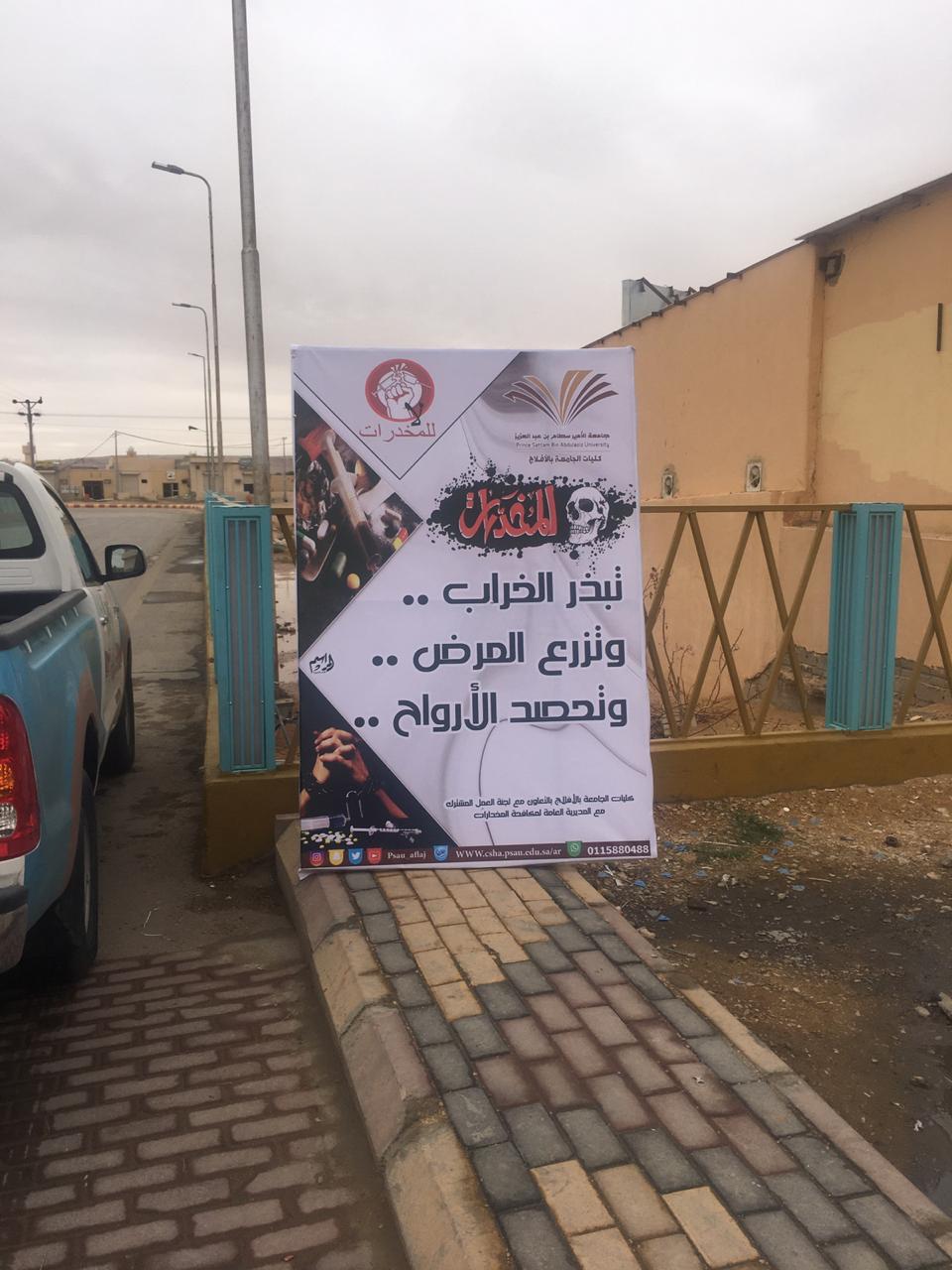 تزامناً مع فترة الاختبارات أطلقت كليات الأفلاج مبادرة توعوية عن أضرار المخدرات بالتعاون مع لجنة العمل المشترك مع المديرية العامة لمكافحة المخدرات. واستهدفت الحملة التوعوية والإعلانية لمبادرة "احذرها" التي أطلقتها كليات الأفلاج كافة شرائح مجتمع محافظة الأفلاج، تضمنت إرسال رسائل توعوية لطلاب التعليم العام والتعليم الجامعي والمجتمع تجاوز عددها أكثر من 9000 رسالة بالتعاون مع إدارة تعليم الأفلاج، ونشر لوحات إرشادية في شوارع محافظة الأفلاج والمراكز التابعة لها بالتعاون مع بلدية الأفلاج والهدار والأحمر والبديع، كذلك تضمنت المبادرة نشر فلم توعوي في الشاشات الإعلانية في الطرقات والميادين لمحافظة الأفلاج، و تم توزيع أكثر من ٢٠٠٠ مطبوع توعوي لطلاب التعليم العام والجامعي، كما أقيم معرض مصاحب للتعريف بأضرار المخدرات مع بداية الاختبارات وضع فيه لوحات وأفلام ومجسمات توعوية. والجدير بالذكر أن المبادرة ستستكمل فعالياتها مع مطلع الفصل الثاني بندوات ومسابقات في منتزهات المحافظة، للوصول لكافة شرائح المجتمع الأخرى.