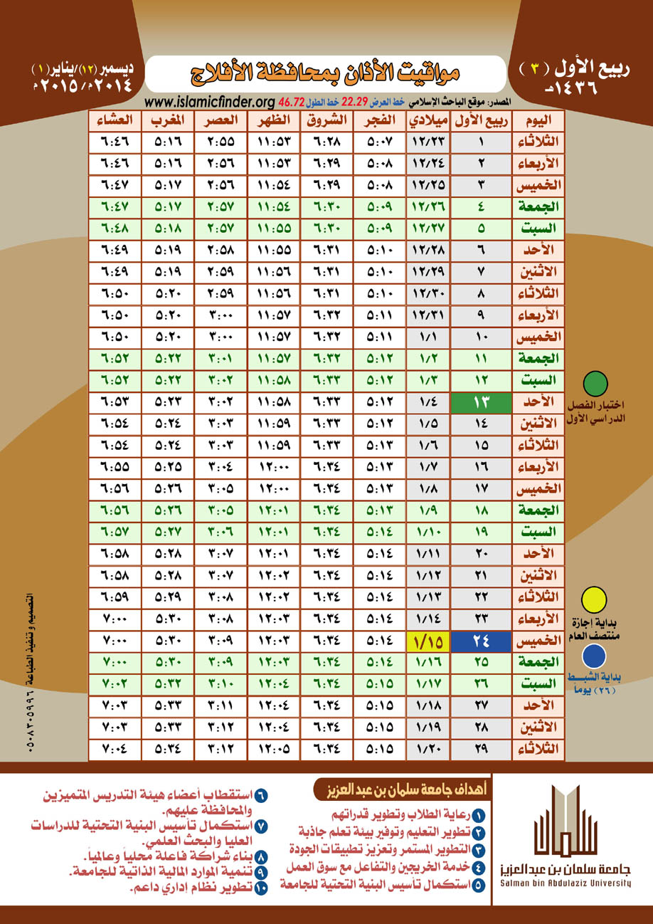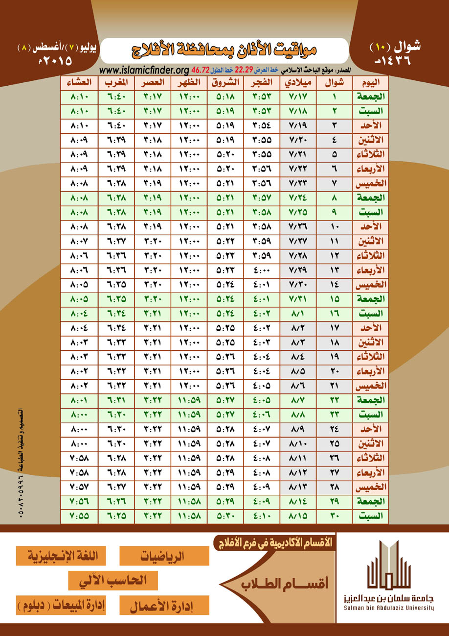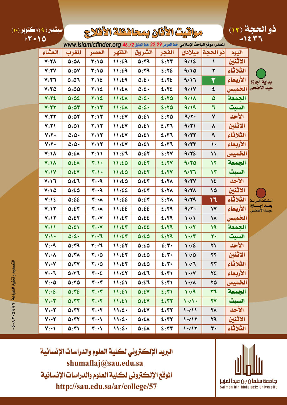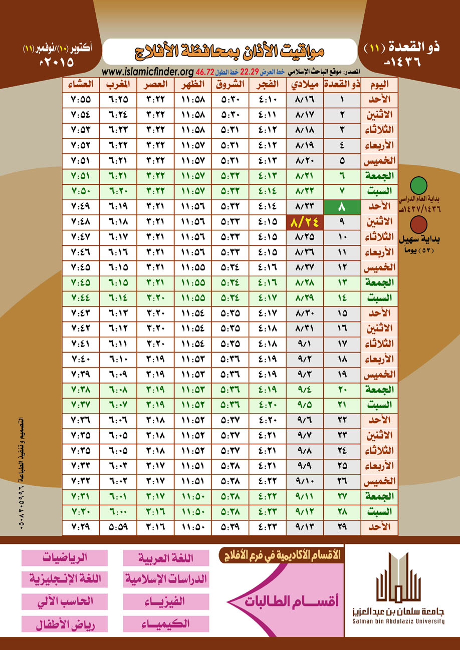 أصدرت كليات الجامعة في الأفلاج - في إطار حرصها على تفعيل دور الجامعة المجتمعي والريادة فيه - تقويم الأذان لمحافظة الأفلاج لعام 1436هـ .
