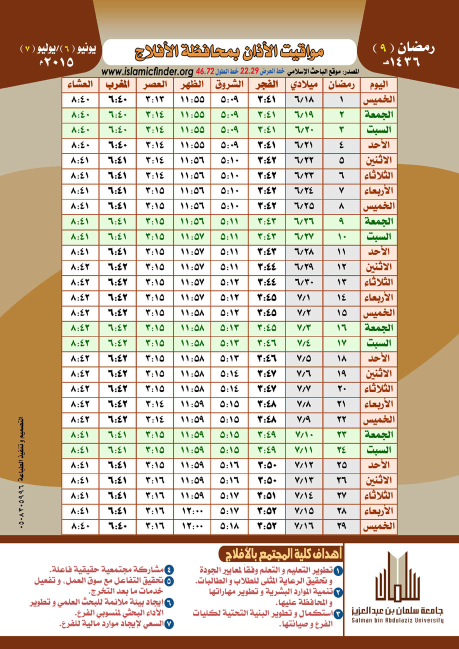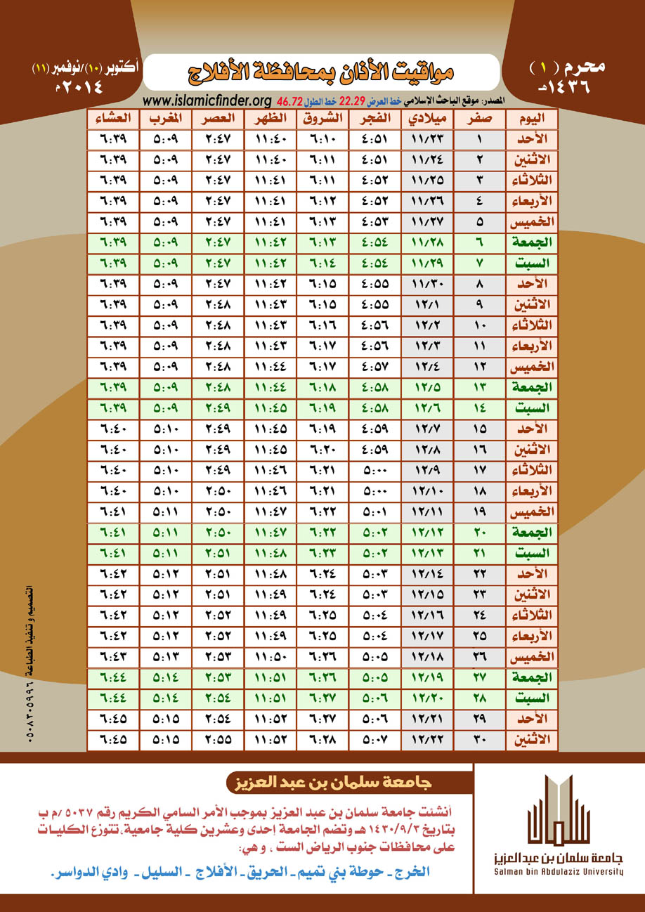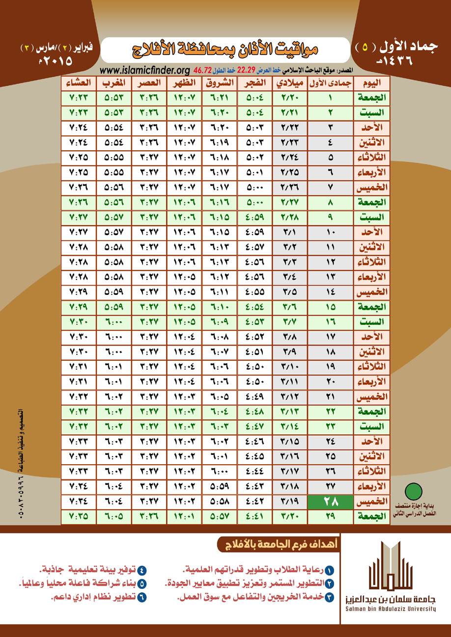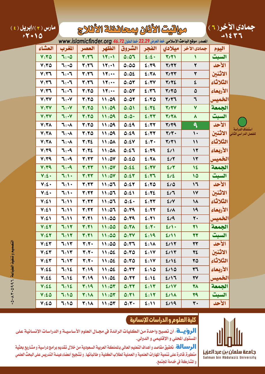أصدرت كليات الجامعة في الأفلاج - في إطار حرصها على تفعيل دور الجامعة المجتمعي والريادة فيه - تقويم الأذان لمحافظة الأفلاج لعام 1436هـ .