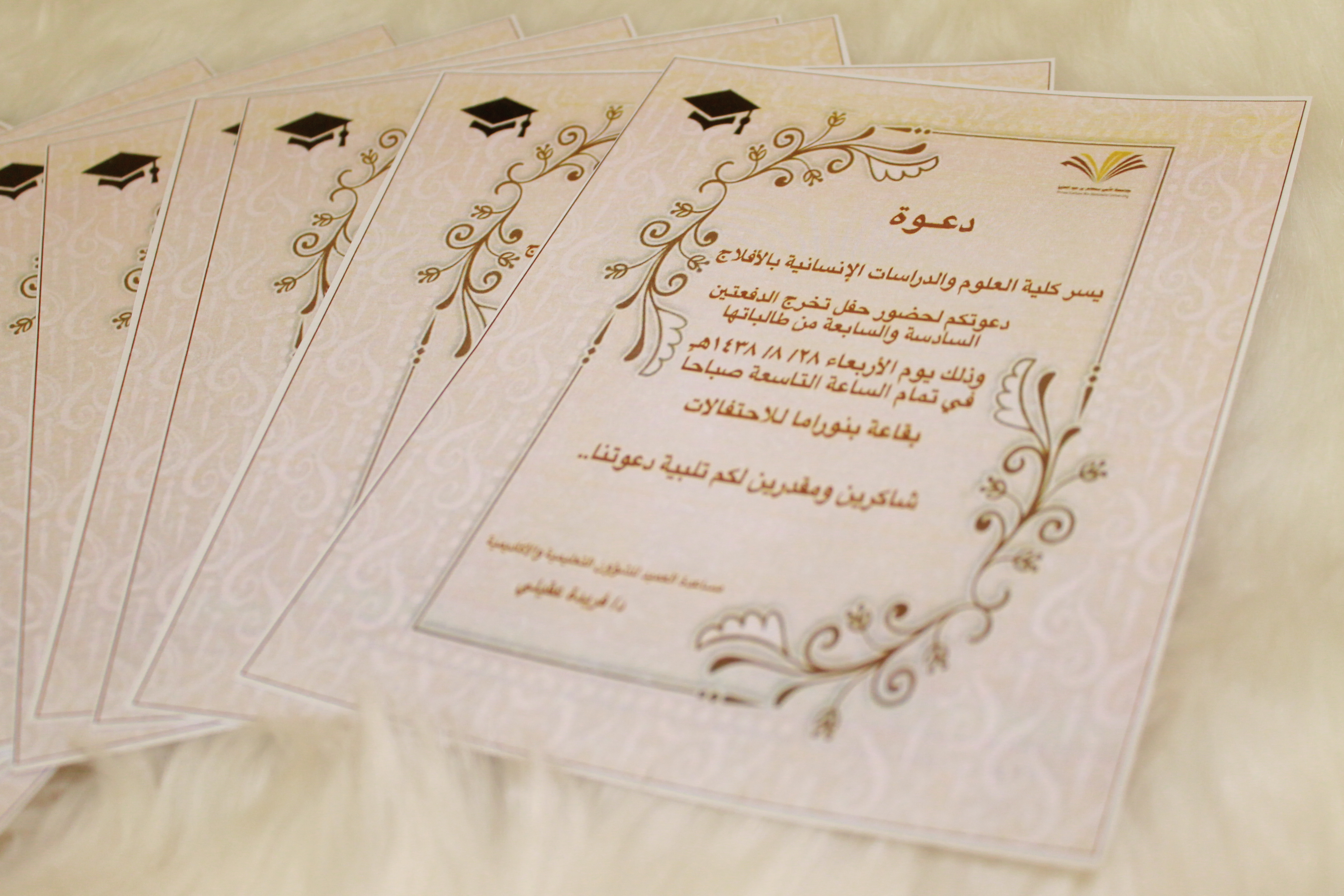 أمجاد الدماعين: احتفلت كلية العلوم والدراسات الإنسانية بالأفلاج يوم الأربعاء الموافق 28/8/1438هـ بتخريج الدفعتين السادسة والسابعة من طالباتها، وذلك في قاعة بانوراما للاحتفالات الساعة العاشرة صباحا، وقد افتتح الاحتفال بالسلام الملكي حيث وقفت الطالبات الخريجات مرددات وملوحات بالأعلام السعودية .
