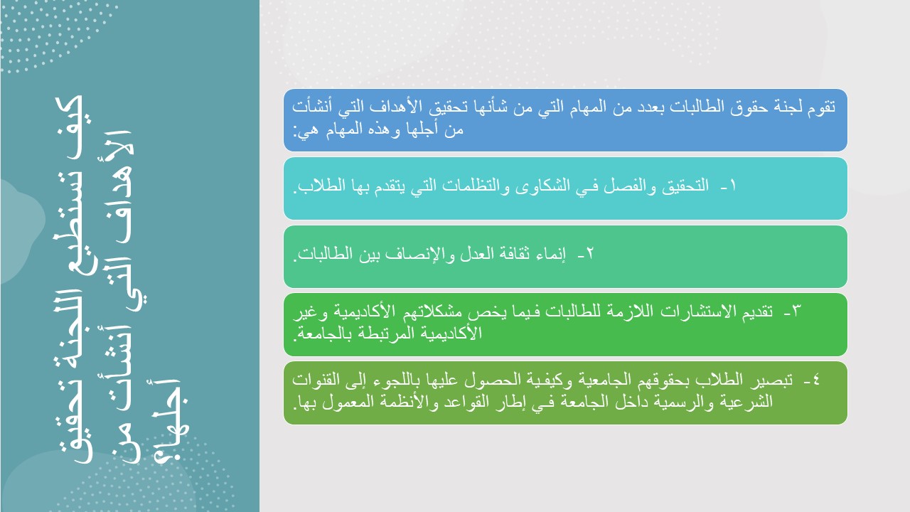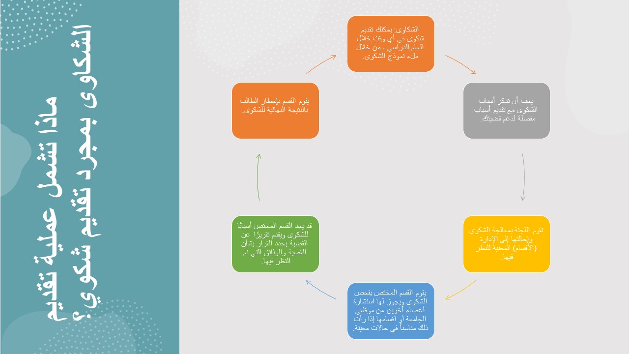افتتحتها بتوضيح اللوائح والأنظمة بجامعة الأمير سطام بن عبدالعزيز في التعامل مع شكاوي الطالبات ، وهل يحق لي كطالبة تقديم شكوى ؟ وآلية تقديمها ، كما ذكرت تعليمات تهم الطالبة قبل تقديم الشكوى بشكل رسمي ، وخطوات طلب تصحيح ورقة إجابة الاختبار النهائي ، تطرقت بعدها إلى عدد من النصائح التي تخص رفع الشكوى واحترام التسلسل الإداري لتقديمها والطريقة الحضارية في التعامل مع الشكاوي .