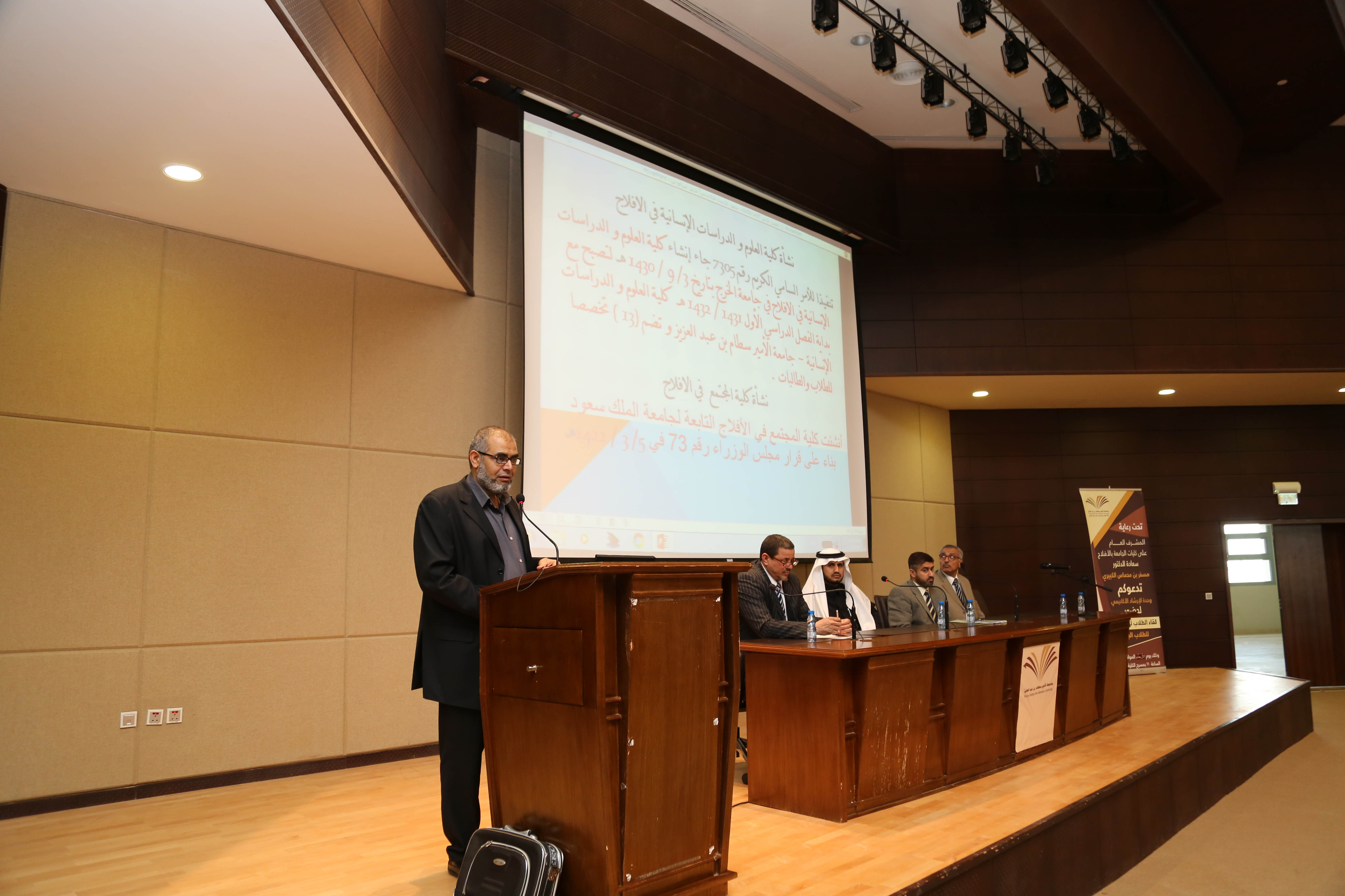حسن الجنيب: برعاية وحضور سعادة المشرف العام على كليات فرع الجامعة بالأفلاج الدكتور مسفر بن محماس الكبيري، أقامت وحدة الإرشاد الأكاديمي بكليات جامعة الأمير سطام بن عبدالعزيز بالأفلاج يوم الأربعاء 25 /5 /1438هـ لقاء التهيئة للطلاب الجدد.