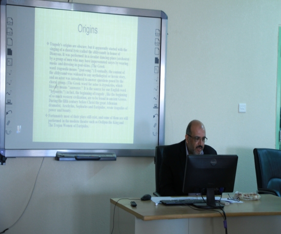 العلاقات العامة- د.أحمد النجمي: عقد قسم اللغة الإنجليزية بكليات الجامعة بالأفلاج لقاءه الدوري بحلقة علمية عن "المأساة الإغريقية" قدم الورقة العلمية بها سعادة الدكتور/ عمر حوارى من أعضاء هيئة التدريس بالقسم، كما أدار الحلقة سعادة الدكتور سعيد أبو ضيف المشرف على القسم وبحضور السادة أعضاء هيئة التدريس بالقسم وقد دارت مناقشة فى ختام الحلقة عن المقارنة بين الدراما الأغرقية ودراما شكسبير وأوضح د سعيد أبوضيف دور النقد الأدبى وخاصة أرسطو فى شرح مفاهيم الدراما الإغريقية