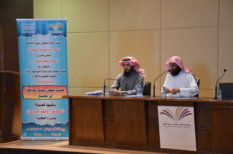 تحت رعاية معالي مدير جامعة الأمير سطام بن عبدالعزيز نظمت وحدة التوعية الفكرية ضمن مشروع ( نحو جامعة واعية -1- ) بالتعاون مع كلية العلوم والدراسات الإنسانية والمجتمع بالأفلاج محاضرة بعنوان ( كيف تكون عضواً صالحاً في المجتمع ) والتي قدمها سعادة الدكتور/ نايف بن عمار الدوسري وذلك يوم الثلاثاء الموافق 1438/3/14هـ وحضر المحاضرة عدد من طلاب كليات الأفلاج بالإضافة لعدد من أعضاء هيئة التدريس. حيث تناول في محاضرته بأهمية توثيق العلاقة مع الله والوالدين والأخرين وأنها من أسباب صلاح الفرد في المجتمع, وبين أصناف الأفراد ( الإيجابي – والسلبي – والمحايد ) والمحافظة على الضرورات الخمس ومقومات صلاح المجتمع.