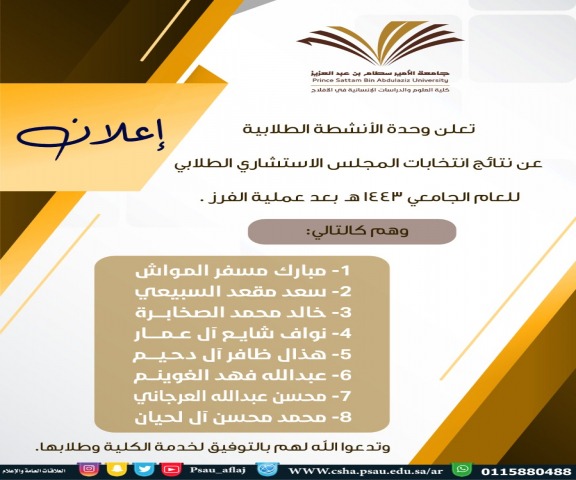 نظمت وحدة الأنشطة الطلابية بكلية العلوم والدراسات الإنسانية بالأفلاج اليوم انتخابات اعضاء للمجالس الطلابية .