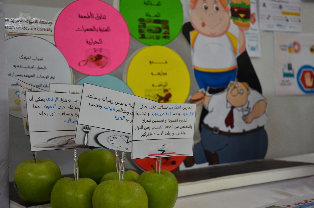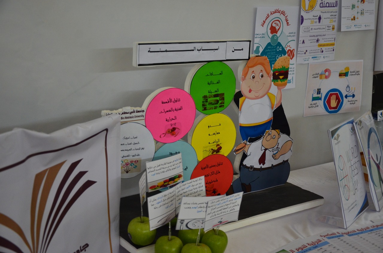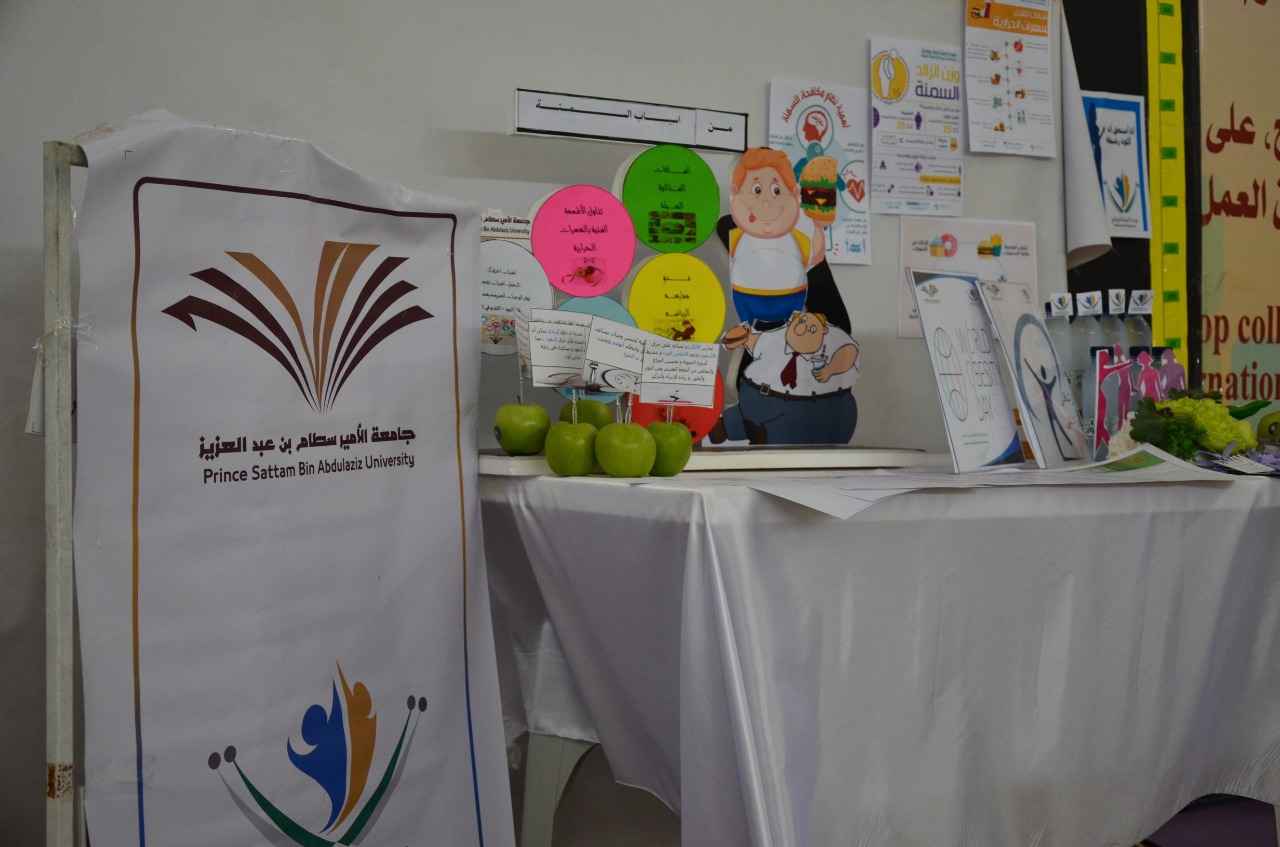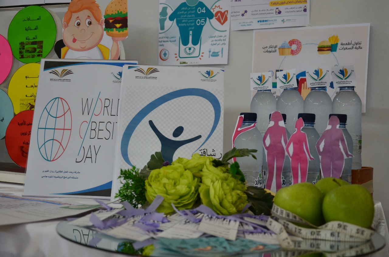 أقامت وحدة العمل الطلابي ممثلة بالبرامج الرياضية بكليات الأفلاج (قسم الطالبات) يوم الخميس 1441/2/11هـ الساعة العاشرة صباحاً في بهو مبنى الأقسام العلمية برنامج "رشاقتي بإرادتي" بمناسبة اليوم العالمي للسمنة، يهدف البرنامج إلى التوعية بأضرار السمنة وعواقبها على صحة الإنسان، ونشر الحلول لها وكيفية الوقاية منها، والتعريف بالسعرات الحرارية التي يحتاجها الإنسان ويحرقها الجسم بالنشاط اليومي، والتوعية بالأنماط الغذائية الصحية، والحث على الرياضة اليومية. صاحب البرنامج قياس الوزن والطول وحساب مؤشر كتلة الجسم ومعرفة الأوزان المثالية.