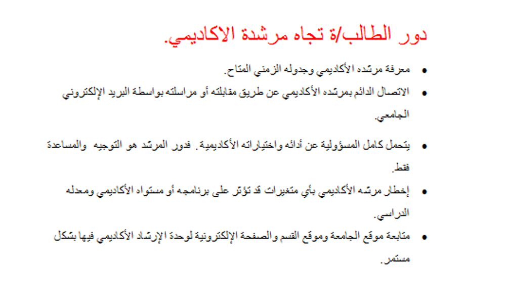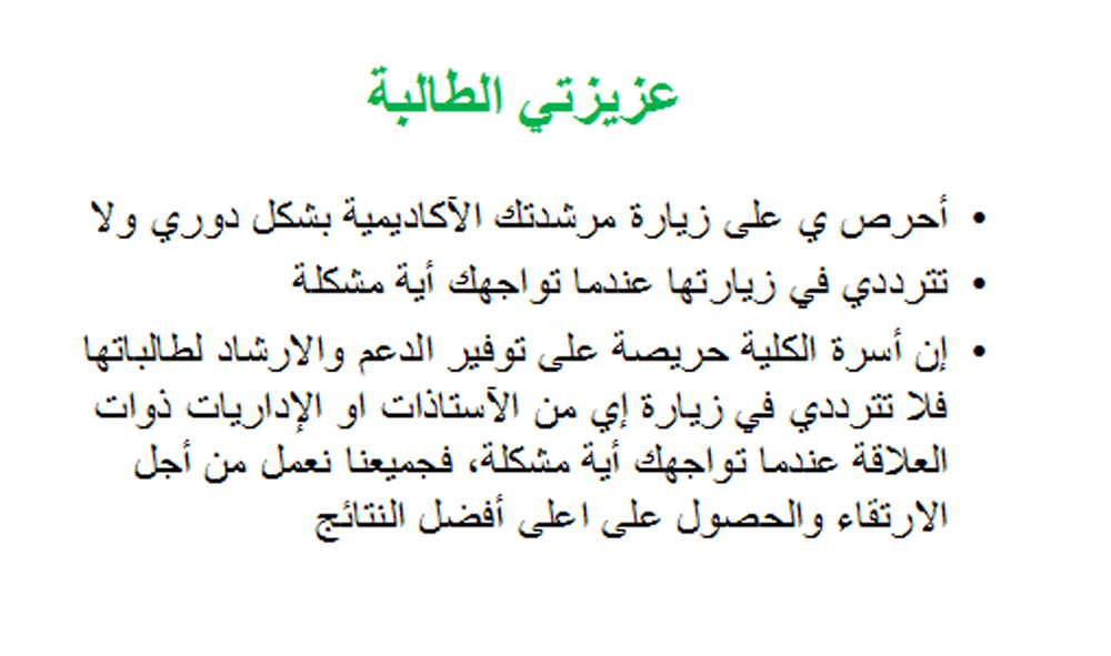 نظم قسم اللغة الإنجليزية بكلية العلوم والدرسات الإنسانية ( شطر الطالبات ) ورشة عمل بعنوان ( دور الإرشاد الأكاديمي ) قدمتها عضو هيئة التدريس والمرشد الأكاديمي للقسم الأستاذة هبة عيساوي ، انطلاقاً من بيان حقوق الطالب تم عقد هذه الورشة للطالبات المستجدات إذ بينت دور الإرشاد الأكاديمي الذي يتمثل في توفير الدعم للطلاب بما يحقق اتمام الخطة الدراسية وتقديم معلومات اكاديمية وارشادية وكذلك متابعة الطالب أكاديمياً وتوجيه الطلاب المتعثرين ومتابعتهم لرفع مستواهم العلمي ومساعدتهم في التغلب على مايواجههم من عقبات ، وايضاً رفع مستوى الوعي داخل الحرم الجامعي بماتوفره الجامعة في سبيل تحسين مستوى الطالب ، كما يساهم المرشد في تنظيم اوقات الطلبة وحسن استثمارها بما يعود عليهم بالنفع اكاديمياً .