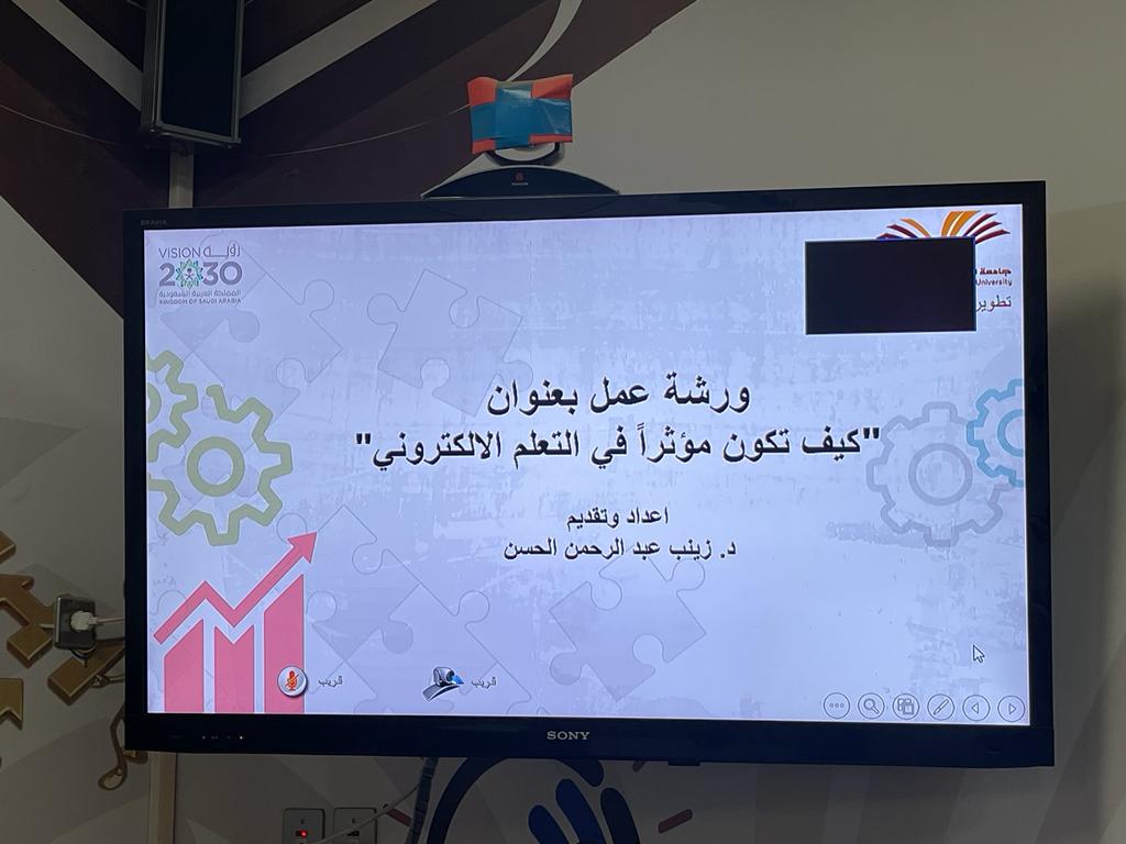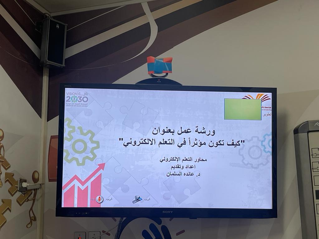 أقام تطوير التعليم الإلكتروني بجامعة الأمير سطام بن عبد العزيز بالتعاون مع كلية العلوم والدراسات الإنسانية بالأفلاج (أقسام الطالبات) ورشة عمل بعنوان (كيف تكون مؤثرا في التعليم الإلكتروني) استمرت لثلاثة أيام في قاعة التدريب ، والتي افتتحتها الدكتورة: (إنعام بشير)