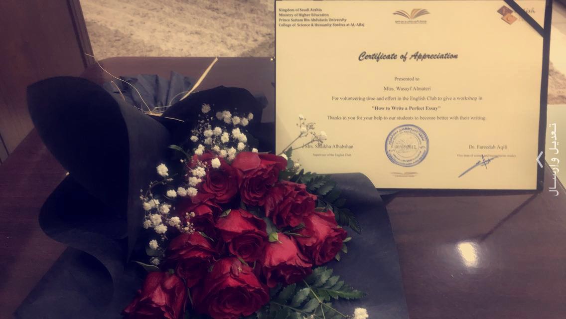 منيره الرشود: نظمت وحدة العمل الطلابي بكلية العلوم والدراسات الإنسانية بالأفلاج ممثلةً في نادي اللغة الإنجليزية ورشة عمل بعنوان (كيفية كتابة مقال) يوم الإثنين 1438/8/5هـ في مسرح الكلية في تمام الساعة التاسعة صباحًا. قدمت خلالها الأستاذة وصايف المطيري خصائص الكتابة الأكاديمية، وطريقة كتابة مقال بطريقة فعالة، والتدريب عليها.