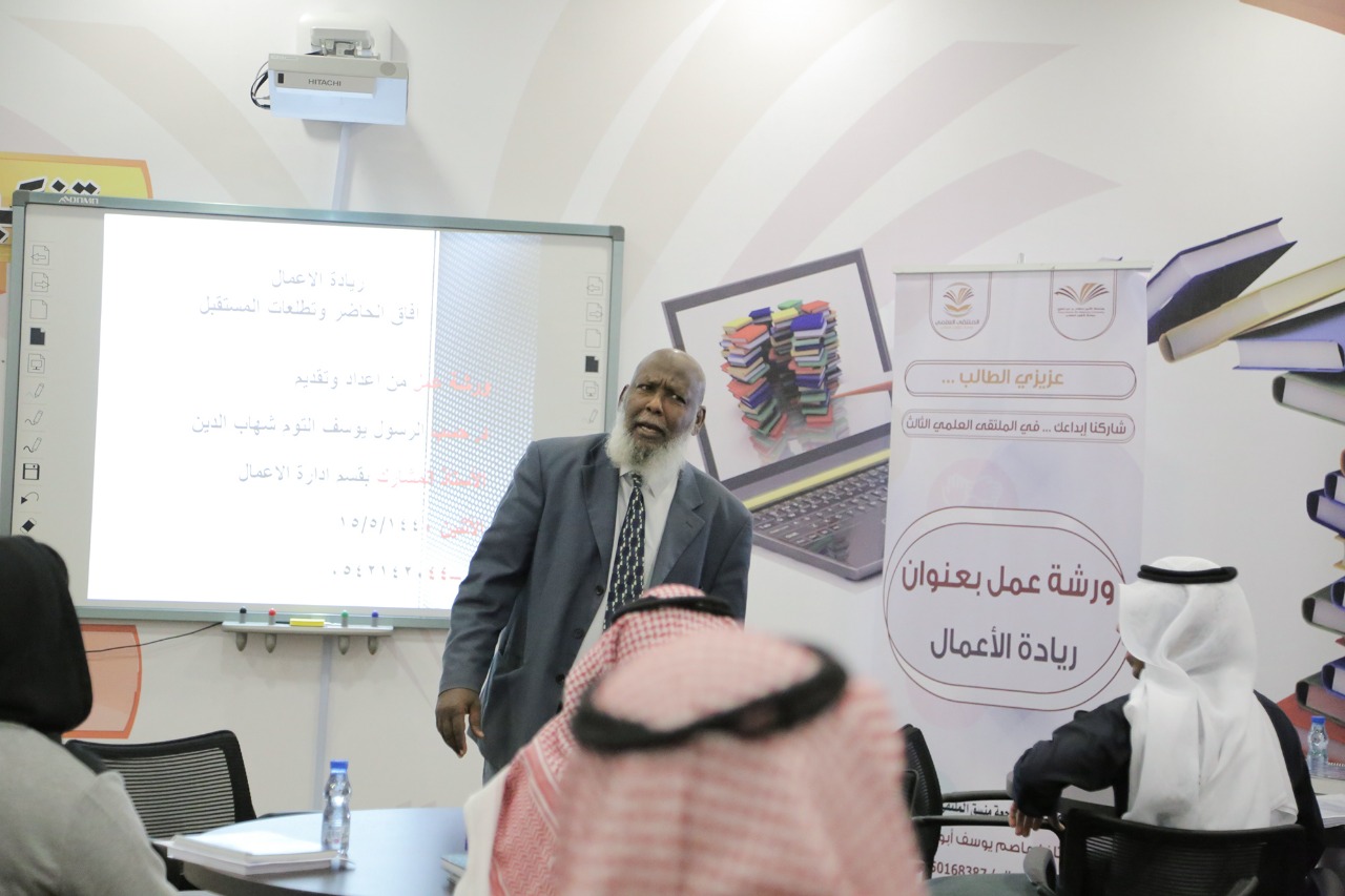 ضمن فعاليات الملتقى العلمي الثالث بكليات الجامعة في محافظة الأفلاج، أقامت لجنة الملتقى العلمي الثالث يوم الأثنين 1440/5/15 هـ ورشة عمل بعنوان " ريادة الأعمال آفاق الحاضر وتطلعات المستقبل " وذلك بحضور 35 طالب من الأقسام العلمية وأعضاء لجنة الملتقى العلمي بالأفلاج .وتناولت الورشة محور ريادة الأعمال ، وتطرقت كذلك الورشة إلى تعريف ريادة الأعمال وخصائصها ومميزاتها، وخصائص ومميزات رائد الأعمال الناجح. وفي الختام أجاب معد الورشة الدكتور حسب الرسول يوسف التوم شهاب الدين ، على اسئلة واستفسارات الطلاب ، وأعطى المدرب نبذة عن الملتقى العلمي وشروط مشاركة الطلاب في محاور الملتقى.